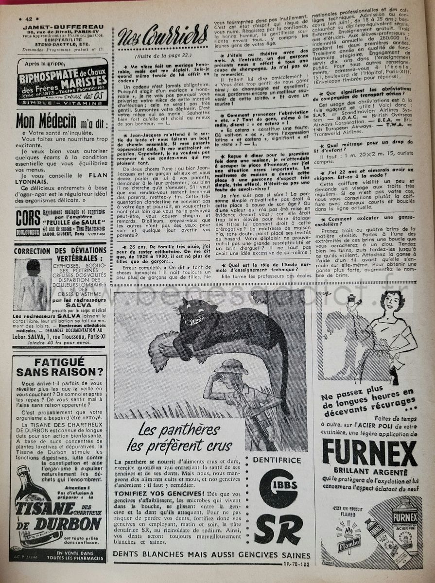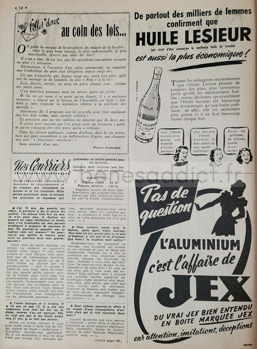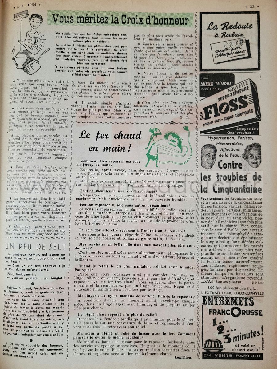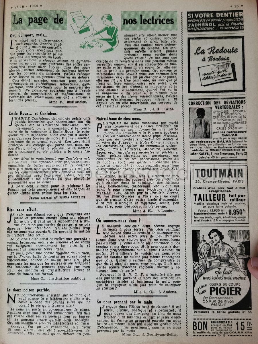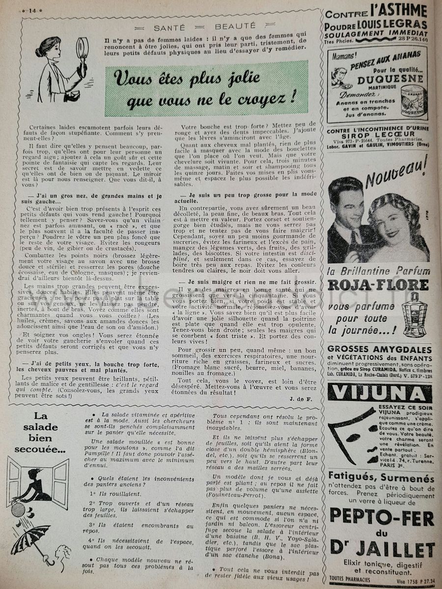 Le magazine comportait aussi des réclames qui informaient sur les produits et services de l’époque. Elles permettent de donner un aperçu du quotidien et des aspirations des femmes et des mères de familles.