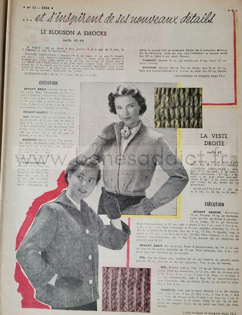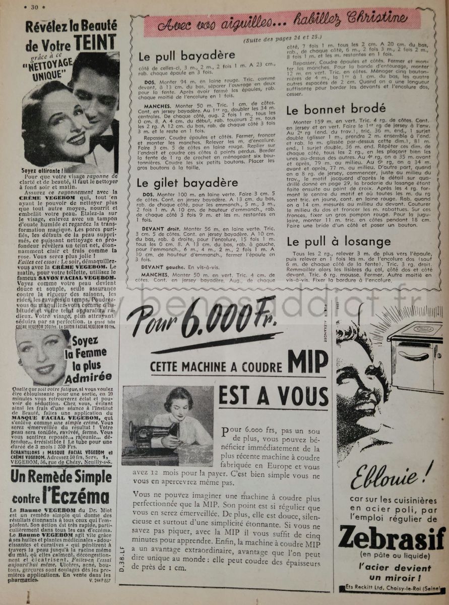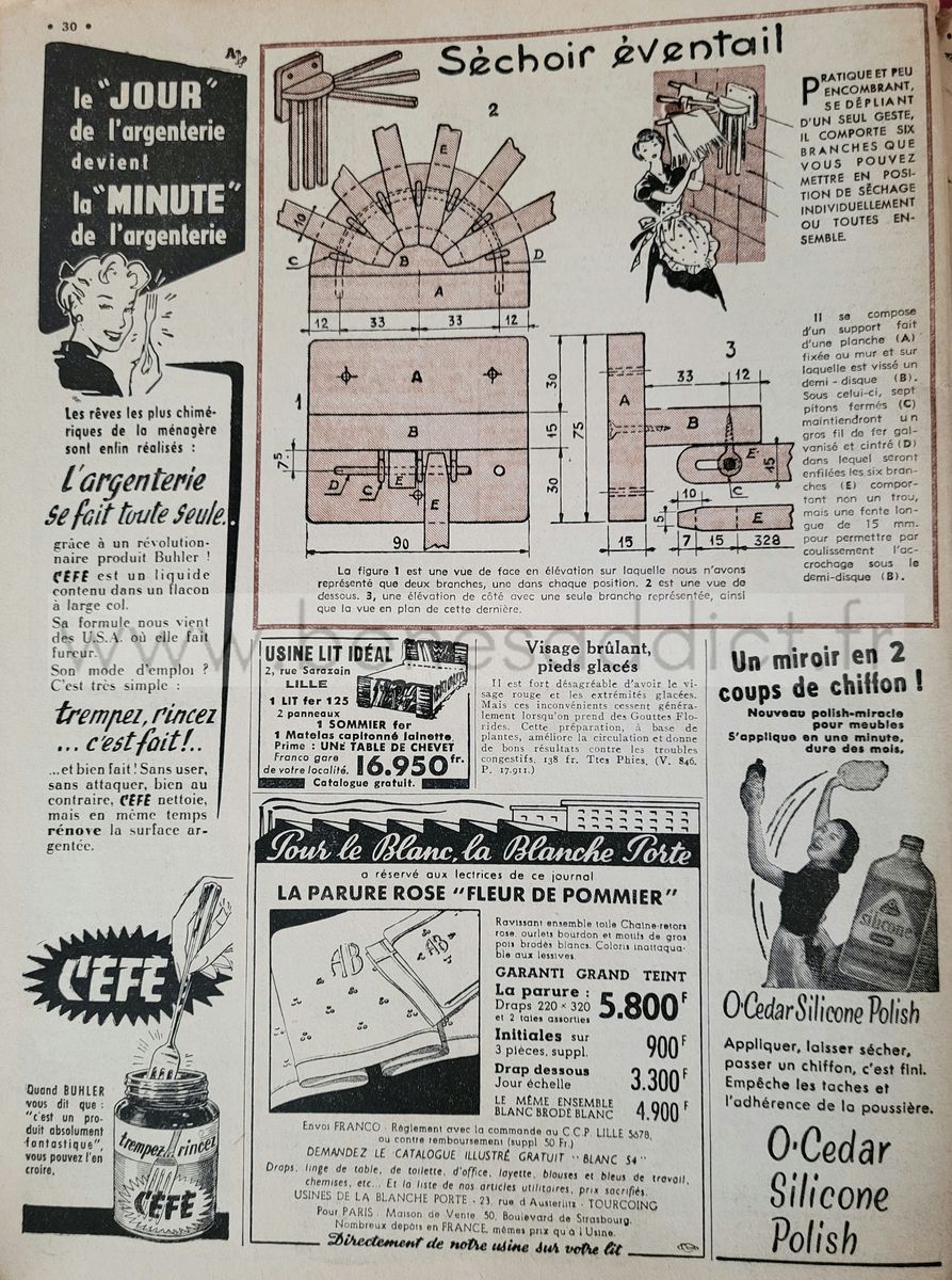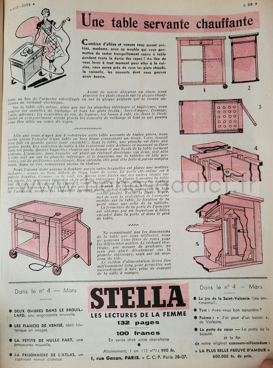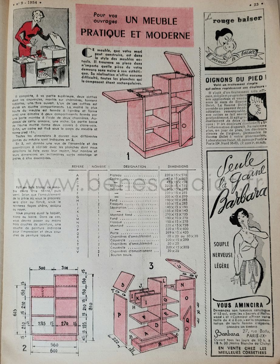On y trouvait aussi des modèles de tricot, tout comme du crochet et même des petits meubles à faire fabriquer par son mari. Cela reflète l’ampleur du « Faire soi-même » des années 50 et dans tous les domaines. Par un souci d’économie tout comme de praticité.