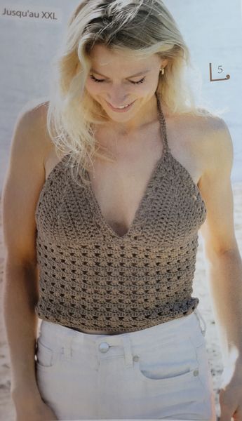 Mon premier choix va pour les tops à bretelles. Le premier est plus simple à faire que le second. L’un est plus sage avec une bande fantaisie ornant le décolleté et le second plus sexy avec ses bonnets crocheté séparément.
