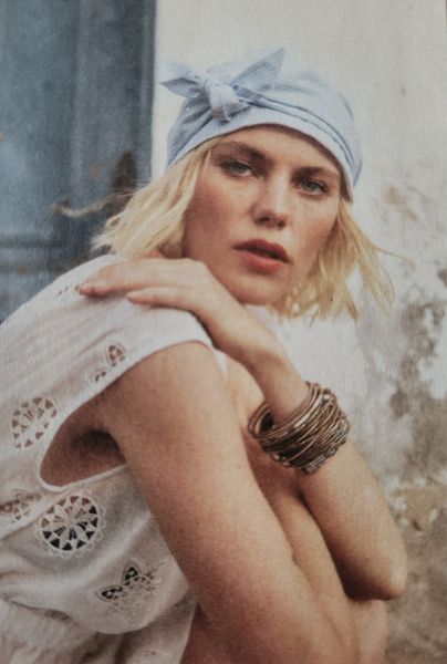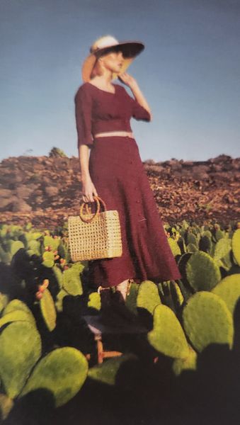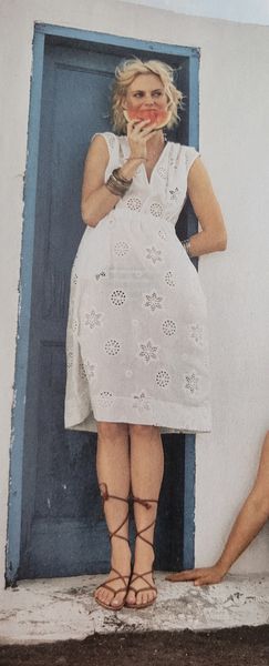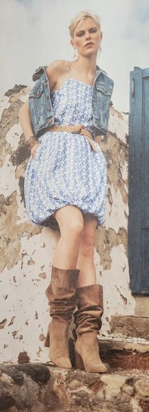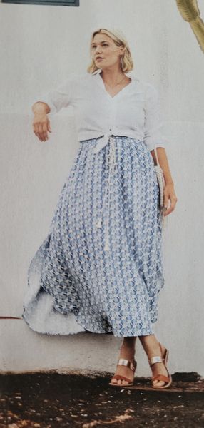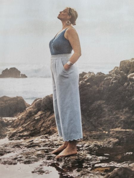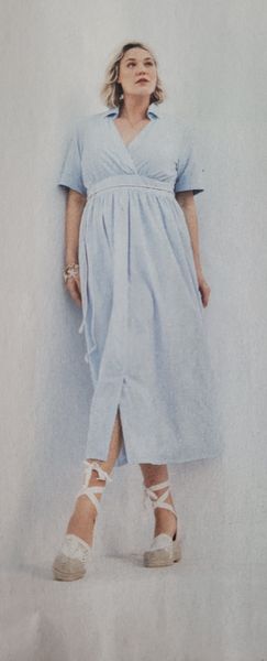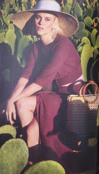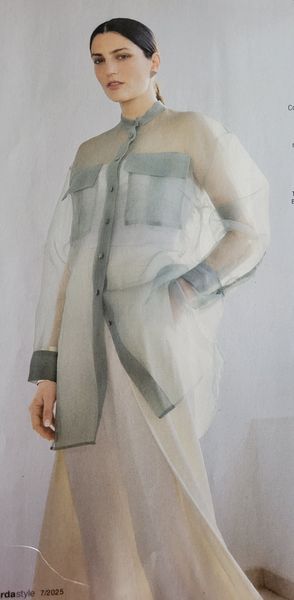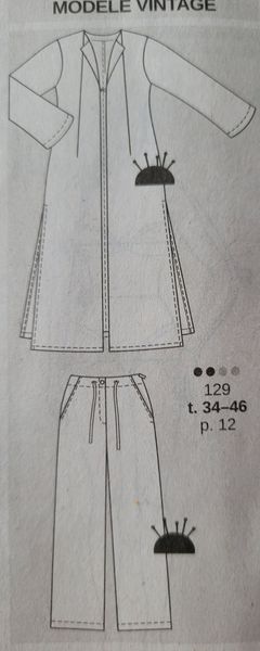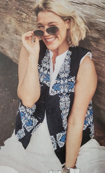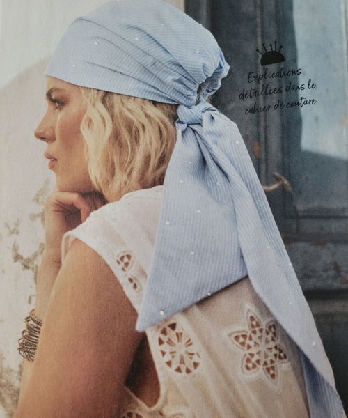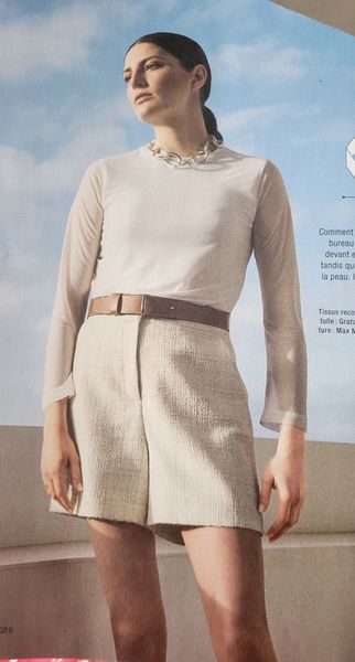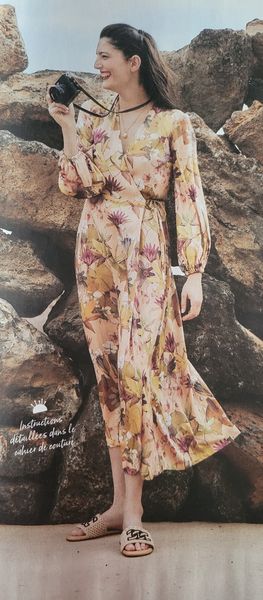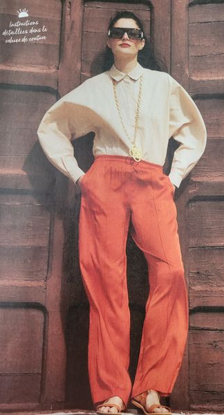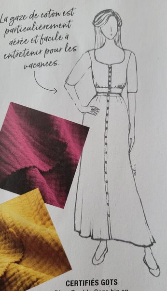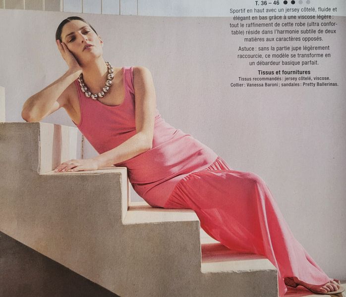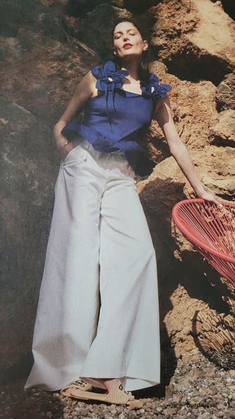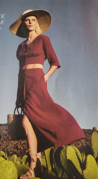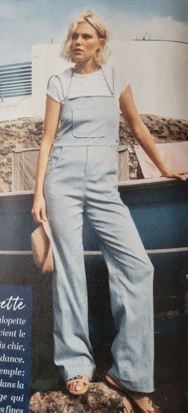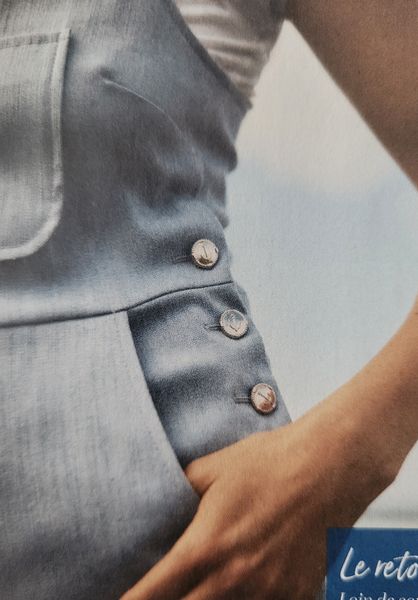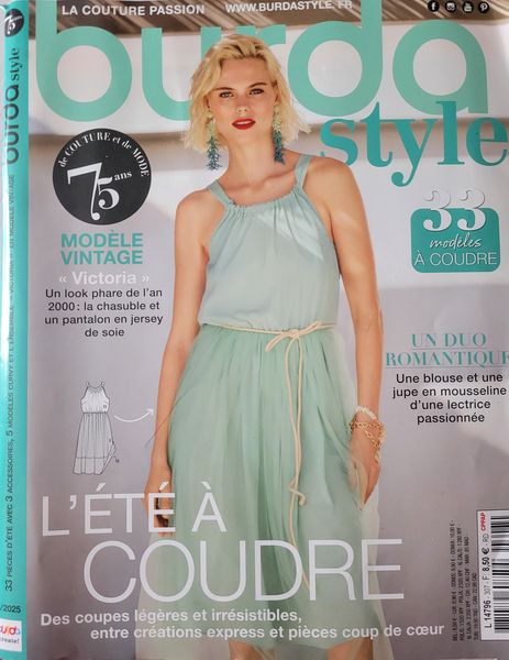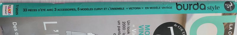 Burda fête cette année ses 75 ans. Pour l’occasion, chaque numéro de 2025 contient un modèle vintage déjà parus dans la revue. Pour celui de juillet, il s’agit d’un ensemble chasuble longue et pantalon.