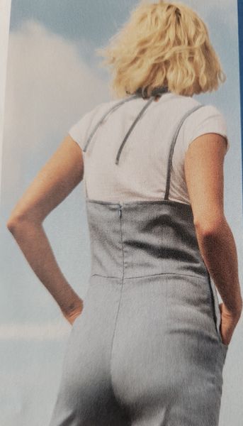 J’adore cette salopette, elle est ajustée à l’aide de pinces. Pas de larges bretelles et de boucles, elles sont remplacées par des liens partant du dos. Ils passent ensuite par une bride sur le pour terminer nouées autour du cou. Une fermeture à glissière dans le dos permet de l’ajuster au plus près du corps.