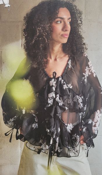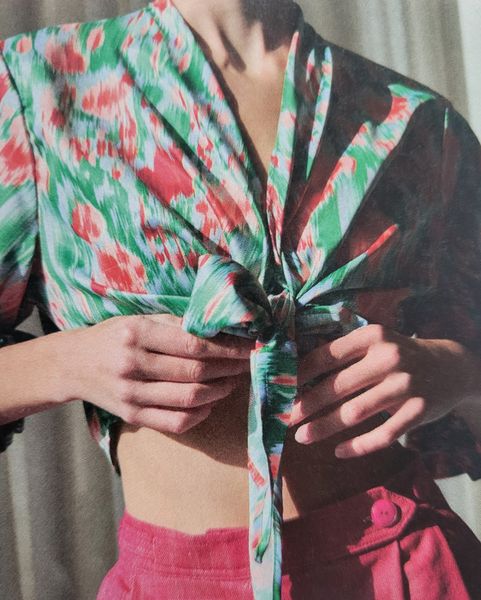 Mon dernier coup de cœur est pour ce top à nouer. C’est un classique, mais si facile à porter avec un top à bretelles. Les manches sont amples et resserrées par un élastique sous coulisse.