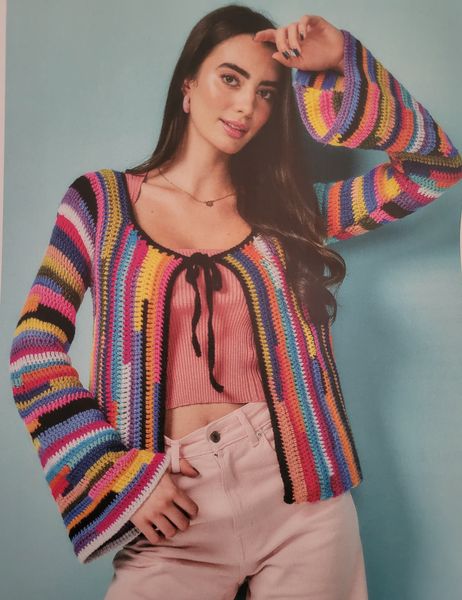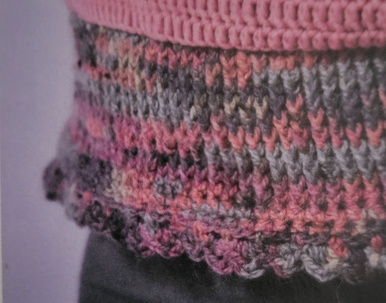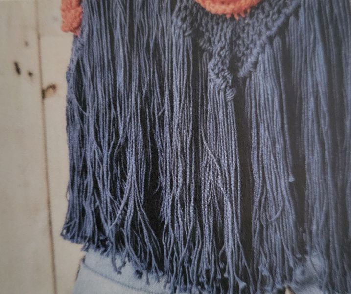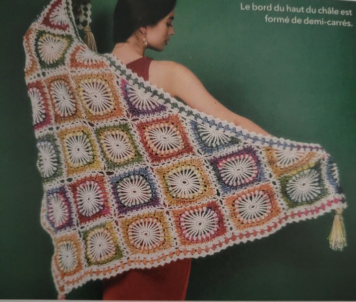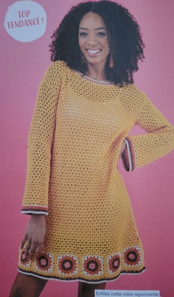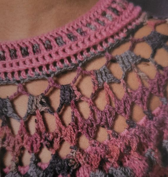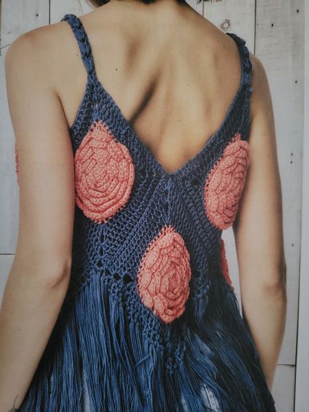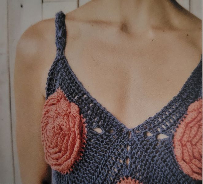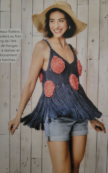 Alors pour ce premier coup de cœur, j’adore l’idée générale d’un top réalisé en carrées granny. J’adore aussi ce modèle de carré avec la jolie rose en relief. Mais j’ai un peu de mal avec le résultat sur la poitrine. Donc séparément pas de soucis, ensemble, j’aime moyennement. Des franges ont été rajoutées pour tout le bas.