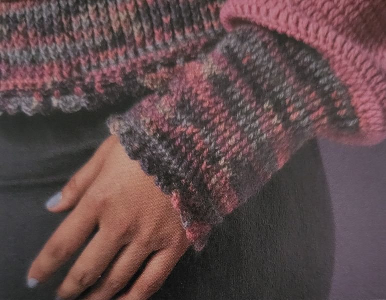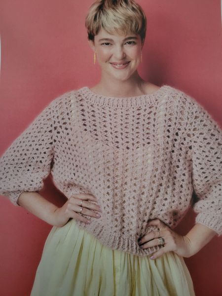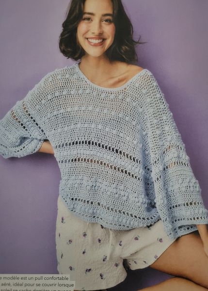 Je ne sais pas en ce qui vous concerne, mais j’ai peu de pelotes, et elles attendent toujours l’ouvrage qui les sublimera. Elles comportent de la laine dans leur composition, ainsi, je cherche un pull aéré à porter avec un top. Ce modèle correspond à mes critères, un point simple et un pull simple.