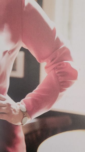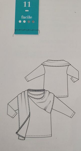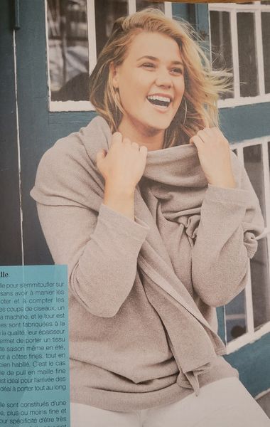Pour les mêmes raisons que ci-dessus, ce pull avec son écharpe attenante débutant en travers du devant. Elle s’enroule autour du cou. Les manches sont longues.