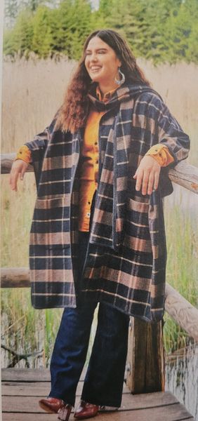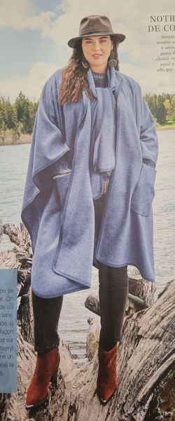 Je suis fan des vêtements dans lequel on peut se lover, s’emmitoufler. C’est le cas de cette cape ou poncho. Nous trouverons des poches plaquées sur le devant. Une large écharpe est cousue sur l’encolure.