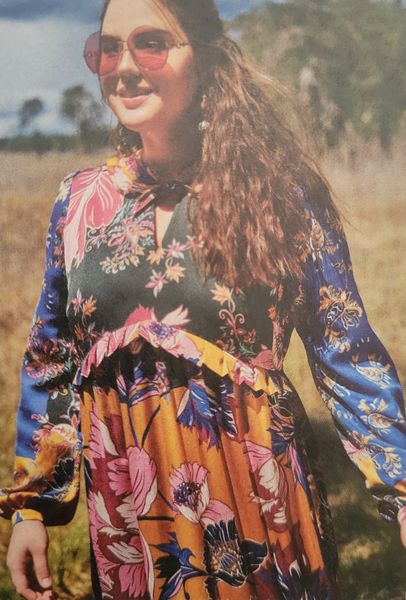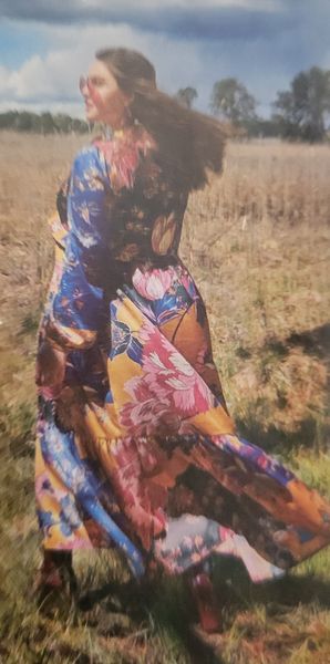 Pour le côté romantique, j’aime assez cette robe. Un peu moins le ruché autour du cou. Le buste comporte une couture en V sous la poitrine. La jupe est froncée et terminée par un large volant. Encore une fois, je n’aime pas le ruché qui borde la couture sous la poitrine.