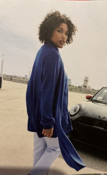 Mon premier coup de cœur va pour ce haut. Il possède des manches longues terminée par une bande de poignet. Le point pas ordinaire se troue dans ce pan d’écharpe attenante à l’encolure en V.