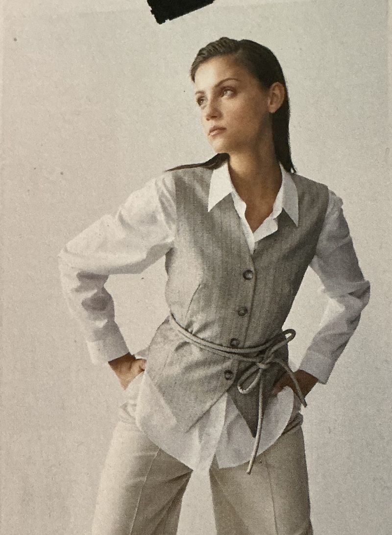 J’aime porter des chemises, façon kimono et rarement fermées. Ce modèle me plait, car il casse le code, chemisier. Il comporte quatre boutons et un pan pour un portefeuille asymétrique. Les manches sont longues et droites sans poignet.