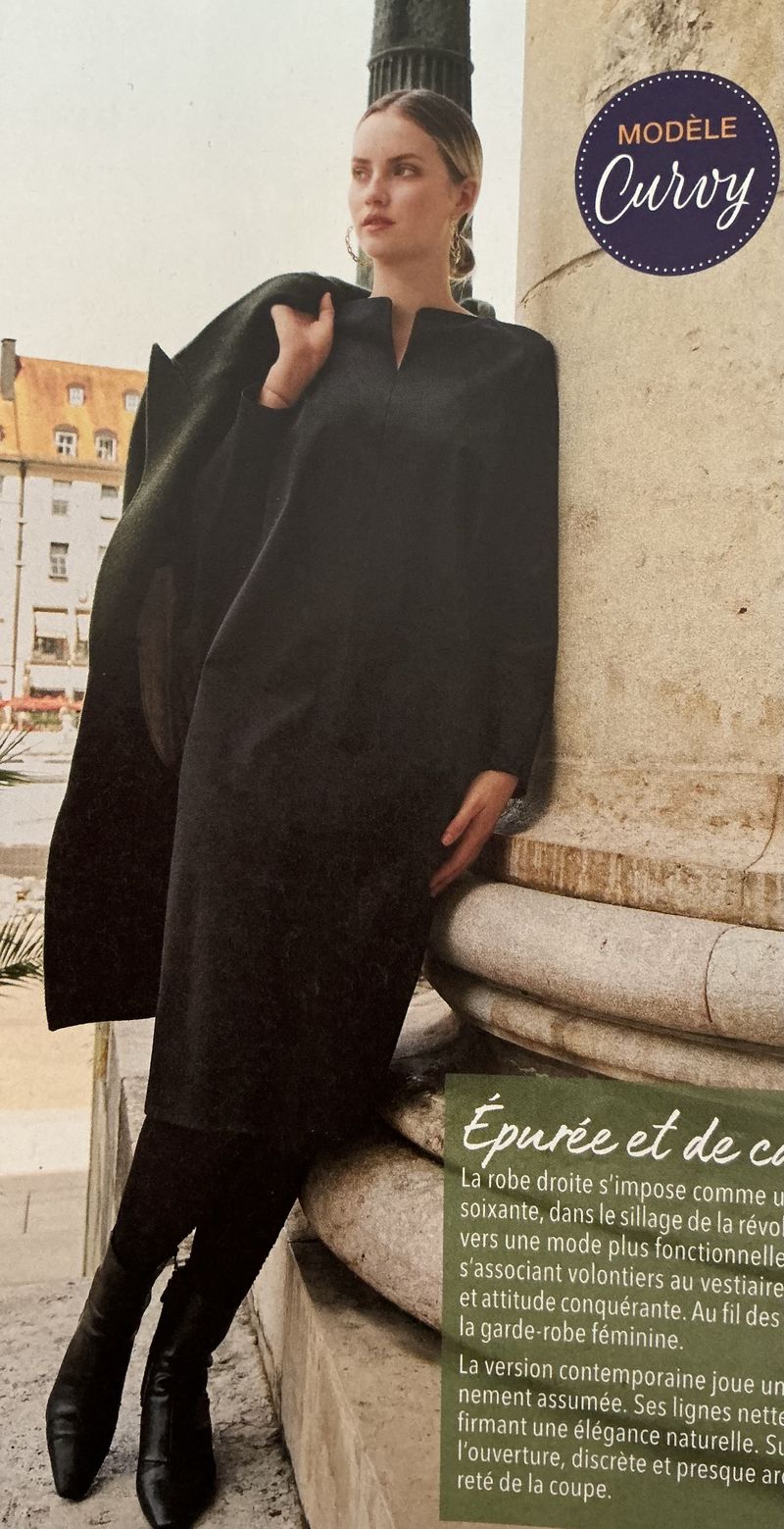 Mon coup de cœur collection grandes tailles va pour un manteau à manches raglans. Il comporte des découpes verticales, accueillant des poches zippées. Le boutonnage se fait de manière asymétrique avec une grande fermeture à glissière. Les bas de manches et le col sont réalisés en tissu différents.