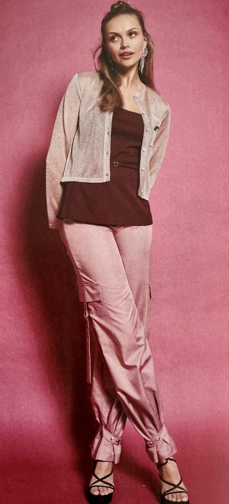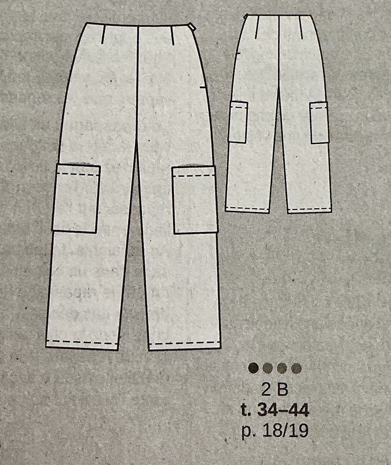 Le pantalon cargo n’a jamais été dans ma garde-robe. Mais il peut être élégant, en tissu brillant, ou satin. Celui-ci possède une ceinture sous enforme à la taille. Un cargo sans poches, c’est un pantalon basique, donc il comporte des poches à rabat sur chaque cuisse fermées à l’aide d’un long lien. Une bande avec pressions permet de resserrer les bas de jambes .