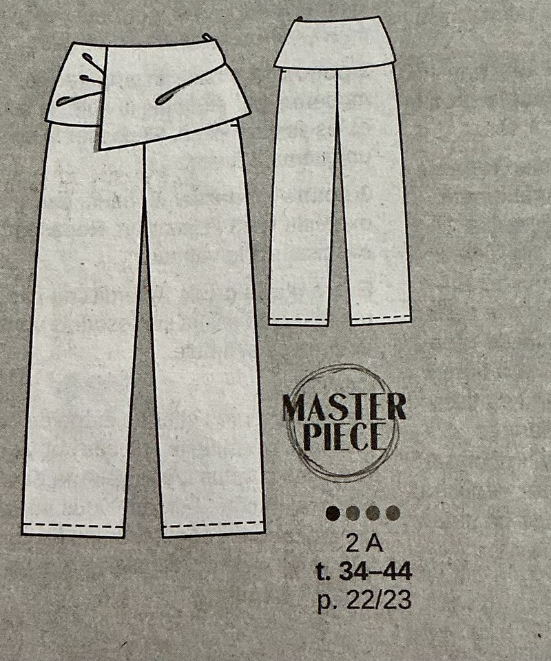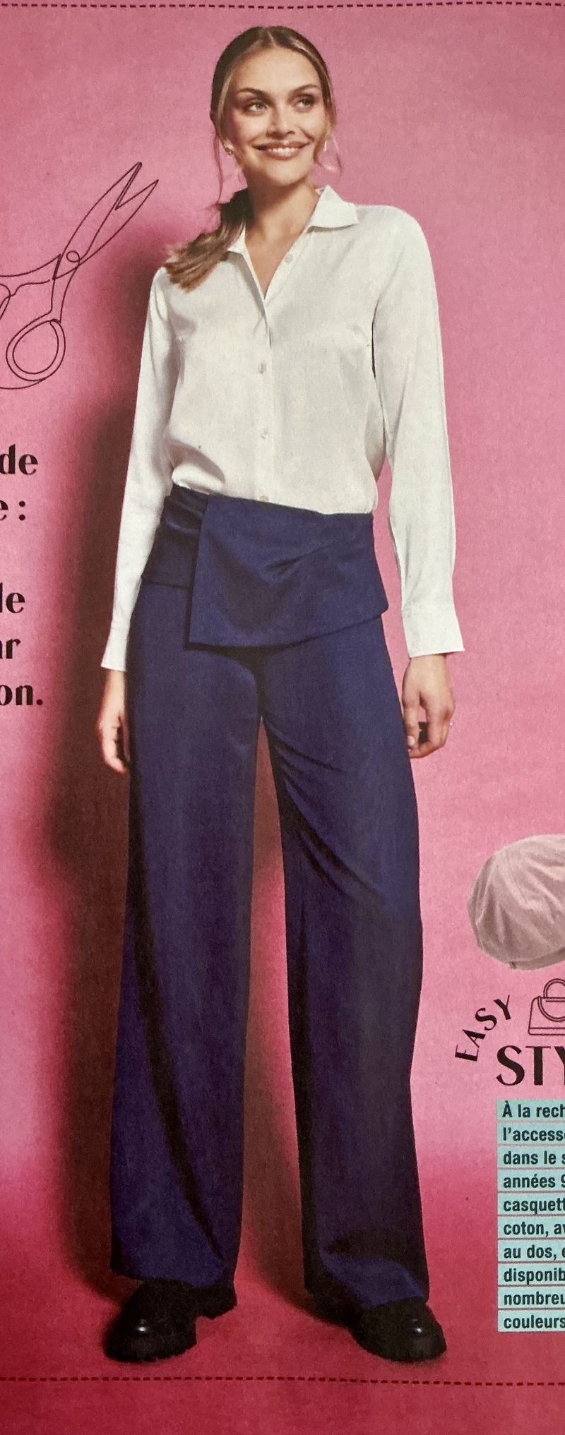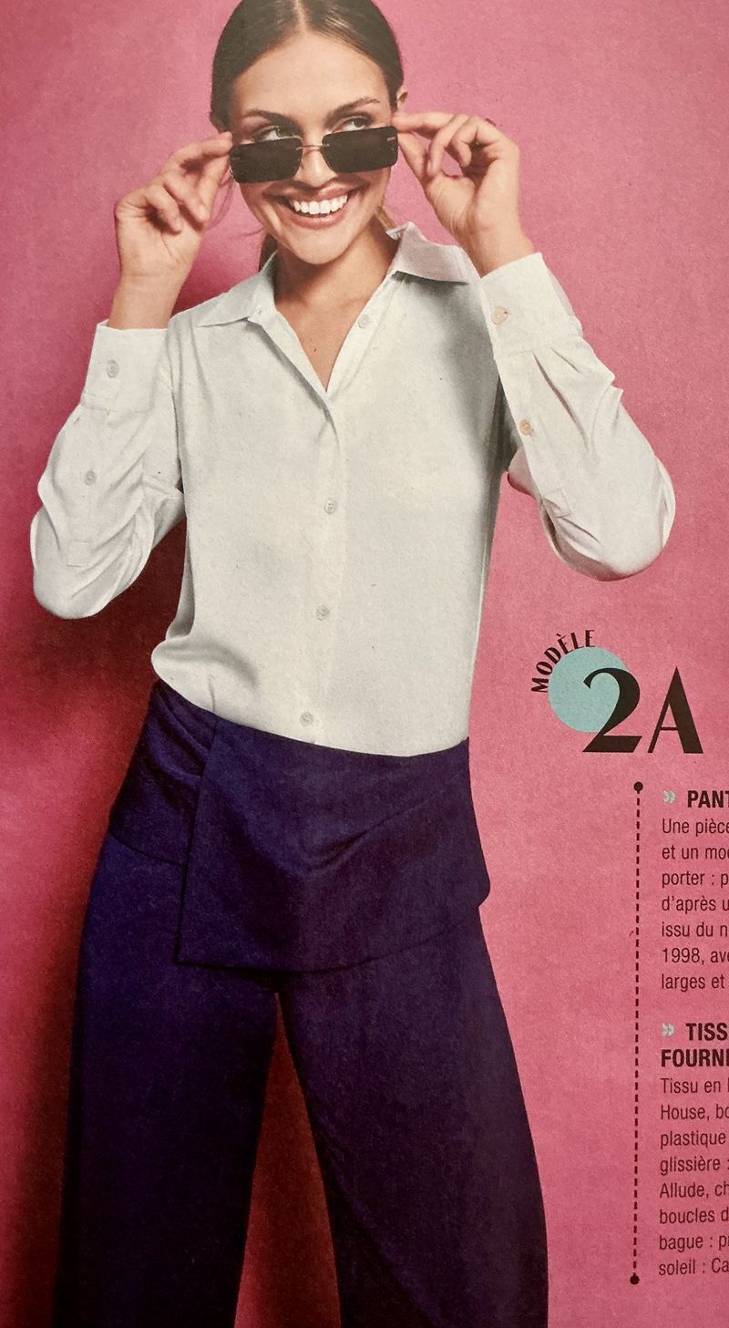 Ce pantalon reprend la base de celui du dessus. Il se ferme avec une fermeture à glissière prise dans la couture de côté. Son plus, avec une très large ceinture drapée autour de la taille. On est presque sur mini mini-jupe. Le résultat est superbe. Nous avons des variantes qui vont plus loin que la longueur d’ourlet pour ce modèle.