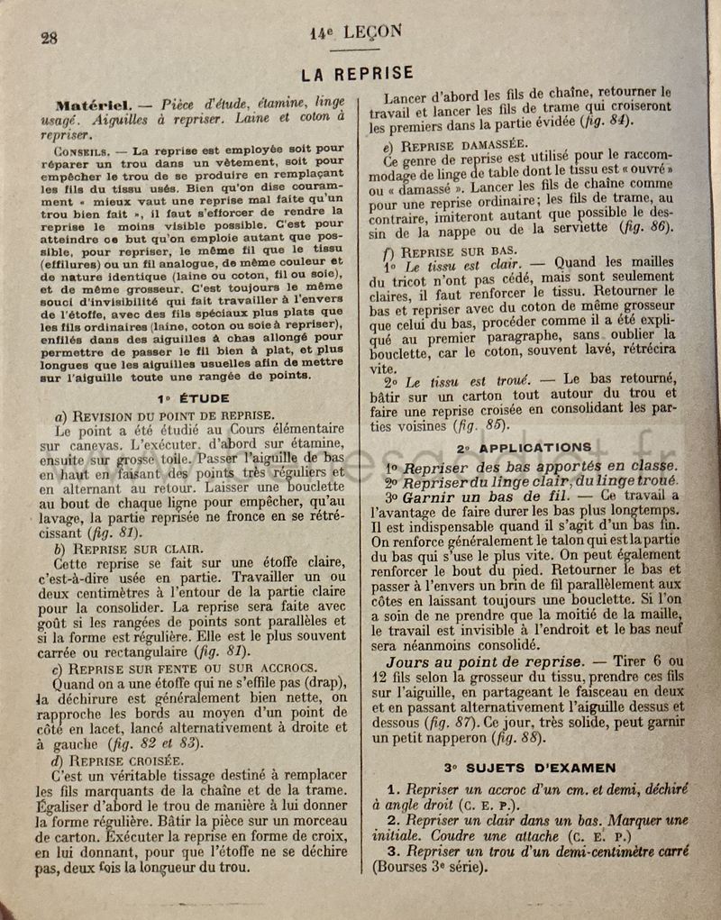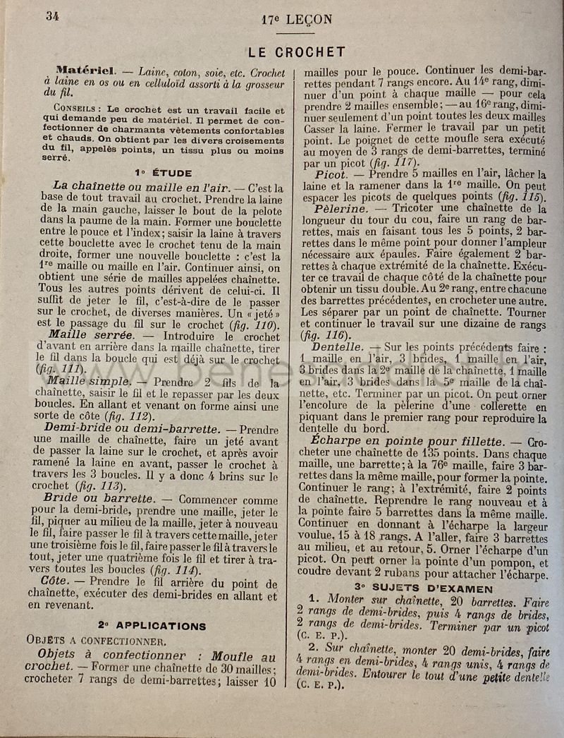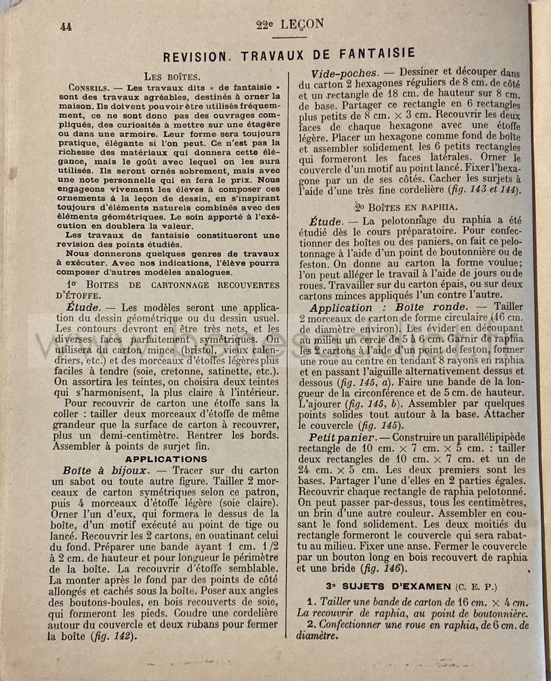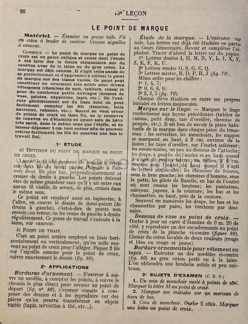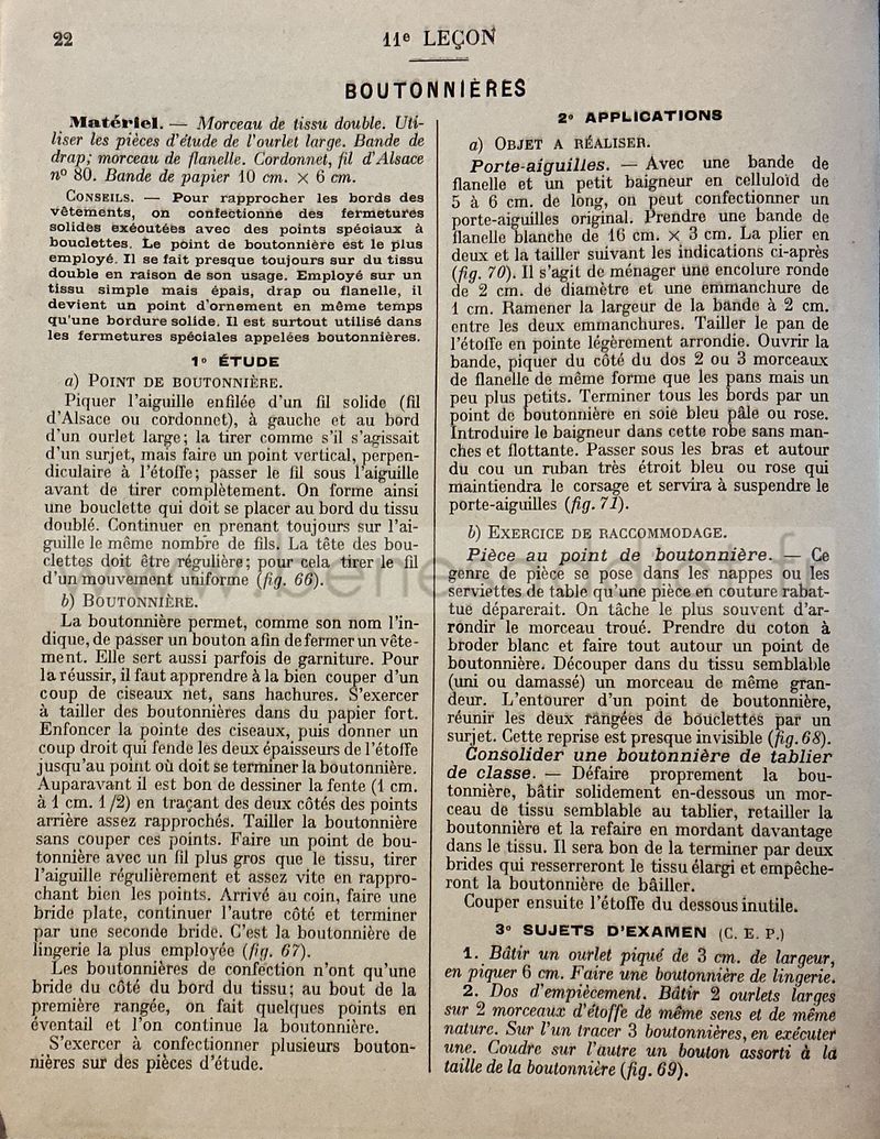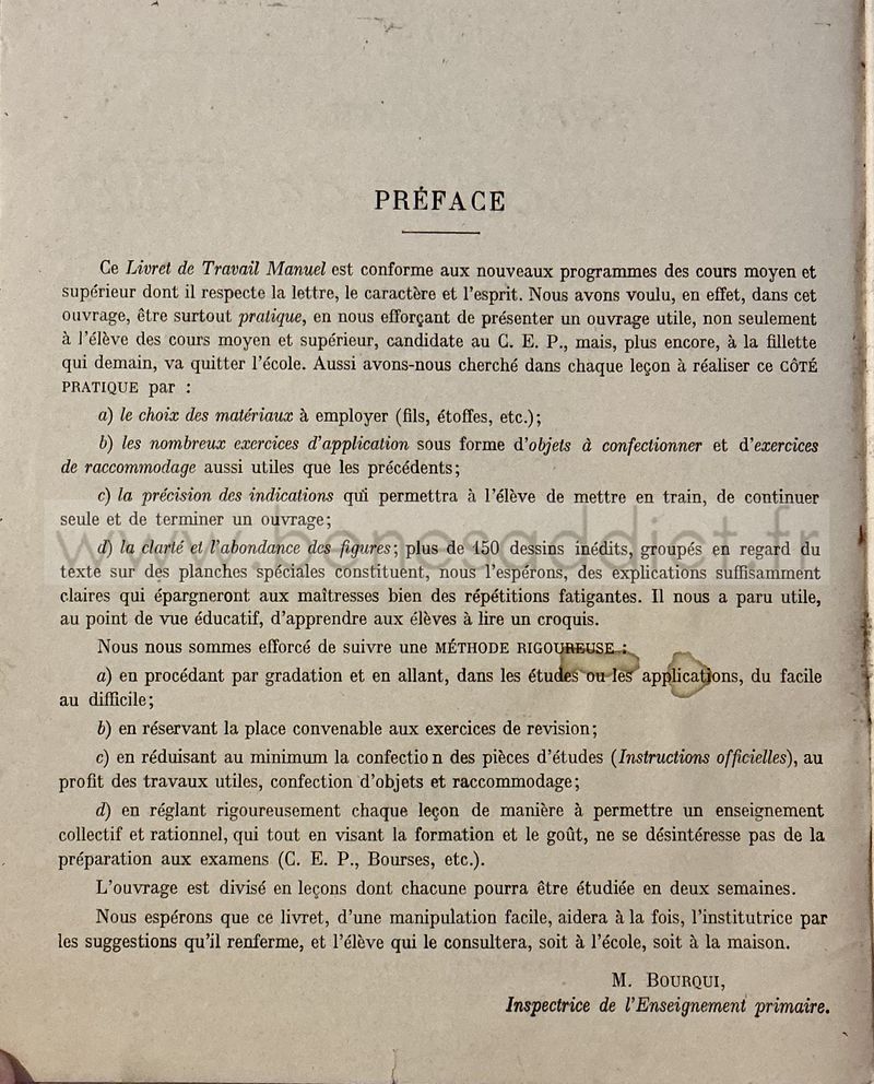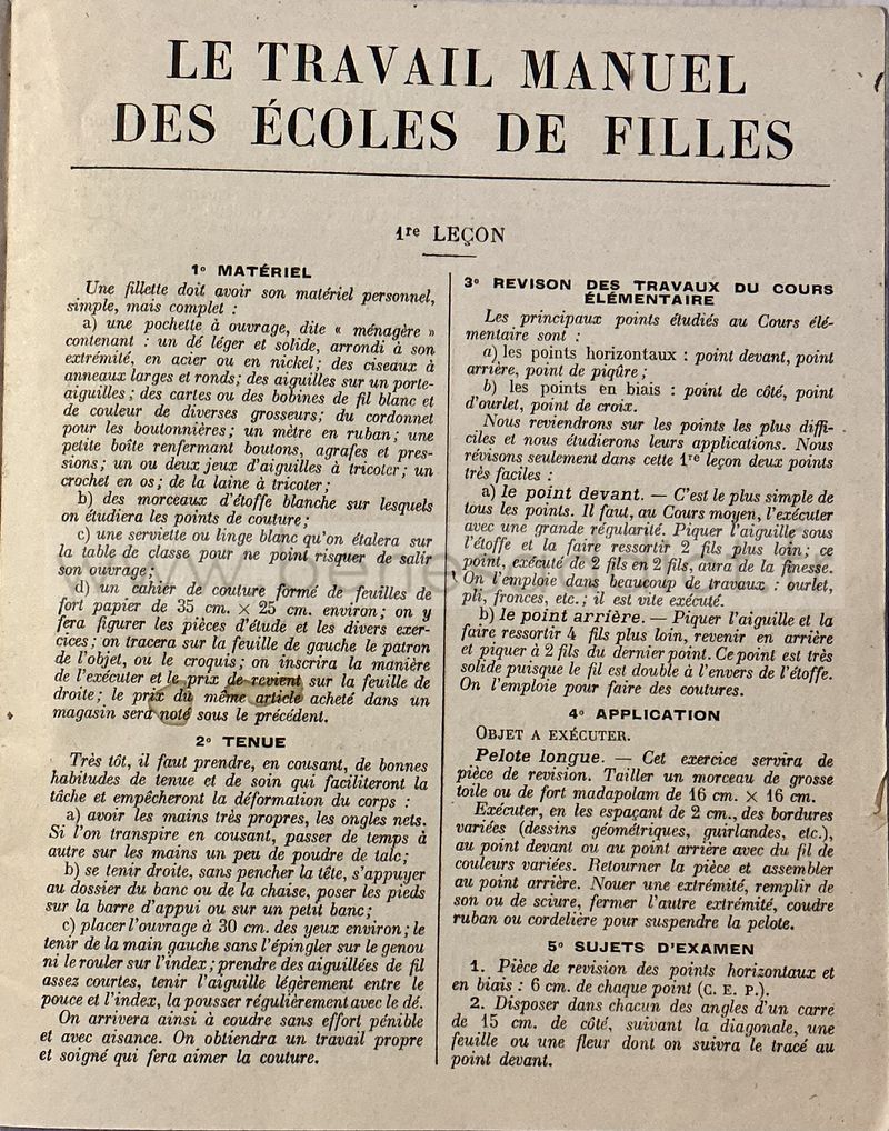 Ce manuel est conforme aux programmes scolaires français de 1923 et destiné à l’enseignement du travail manuel pour les filles au niveau du cours moyen et supérieur.