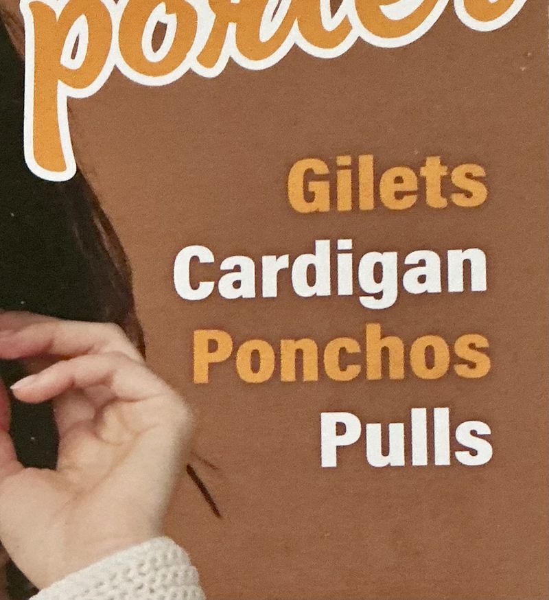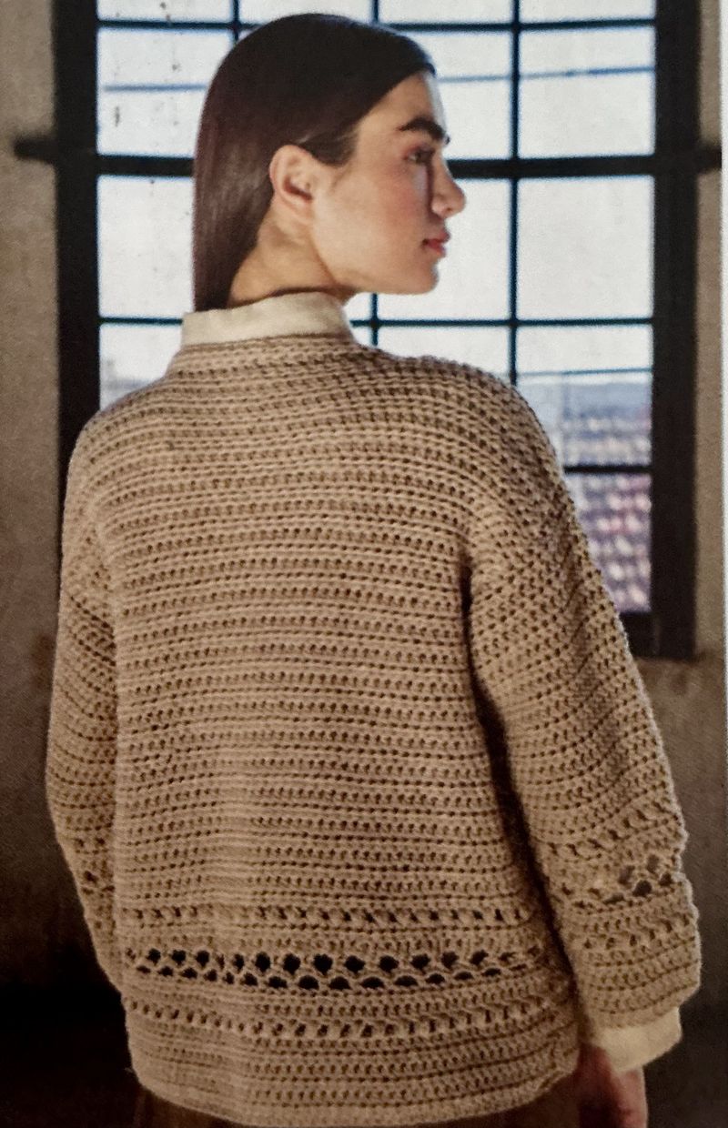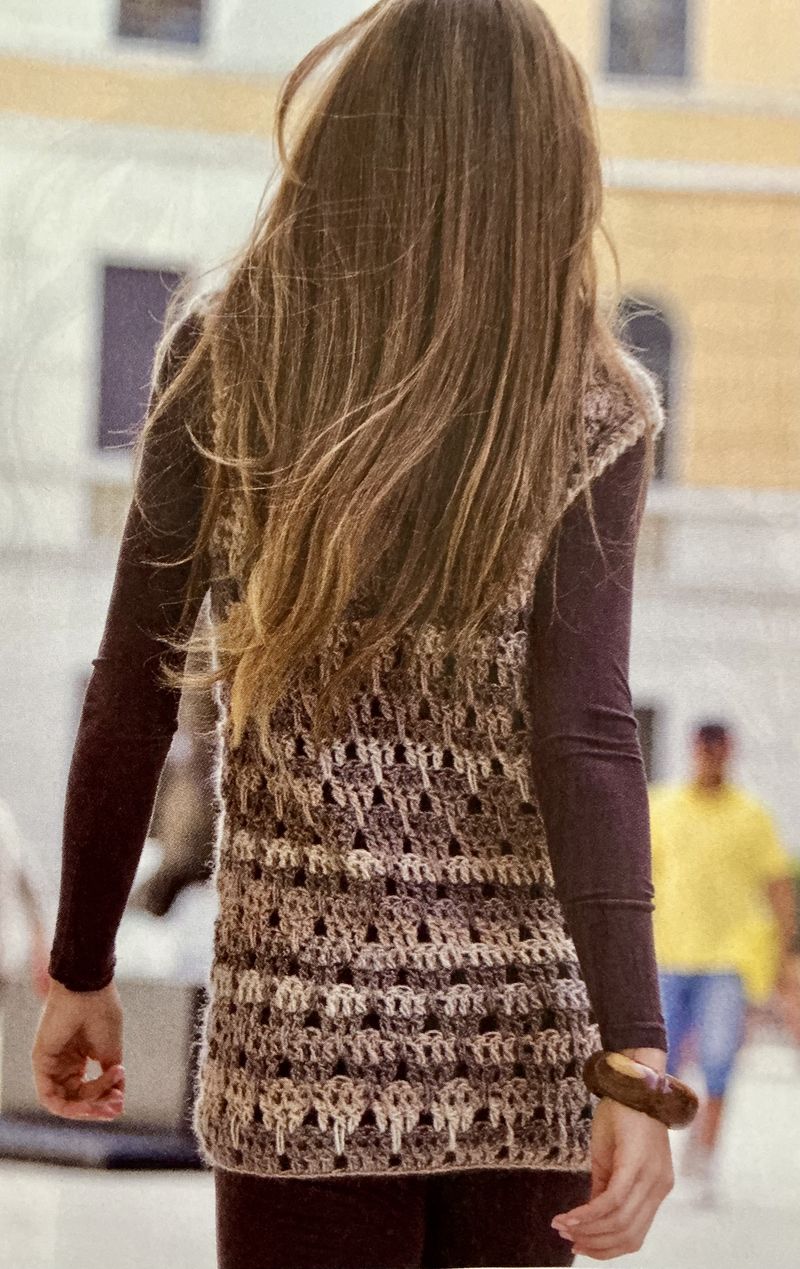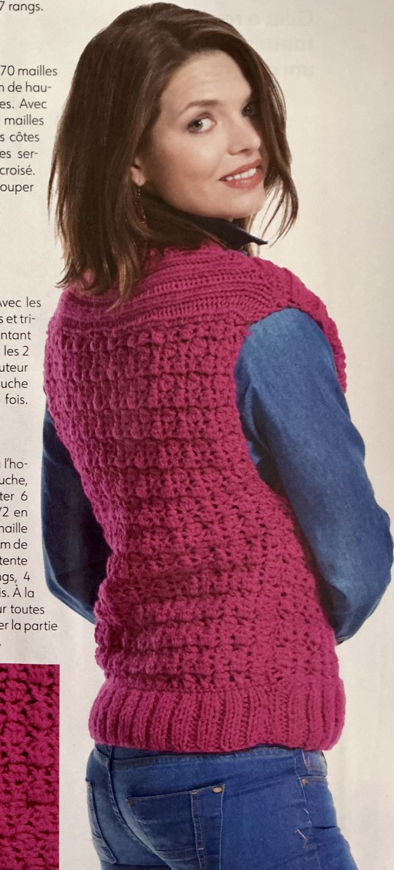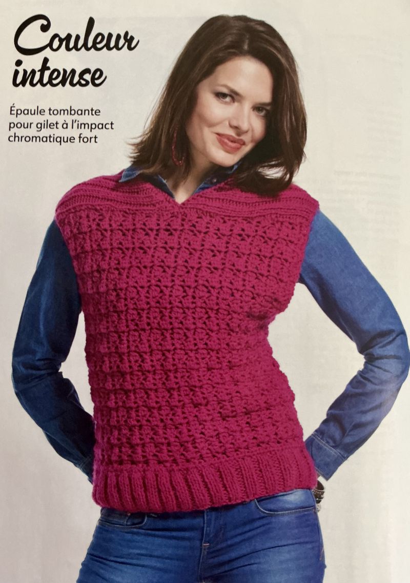 Ici, je ne suis pas fan de la couleur, j’ai banni le beige, le gris et le blanc de mon armoire. Nous avons un gilet tout simple avec une bande d’alternance de points et de jours, cette bande se retrouve aussi sur la manche.