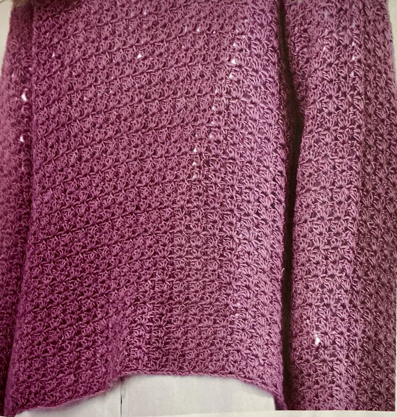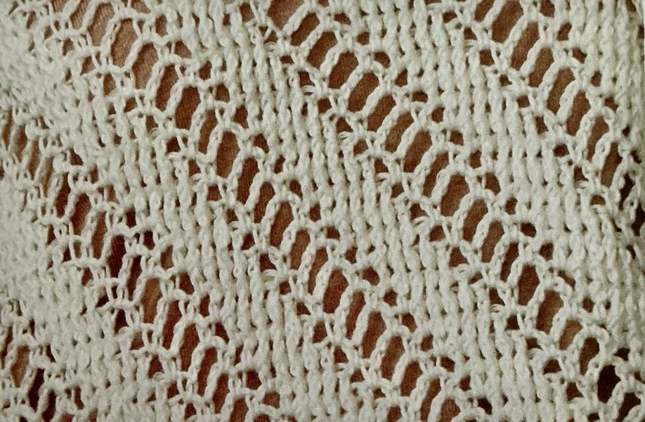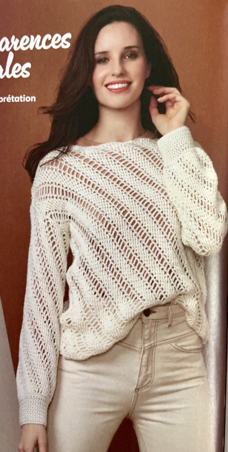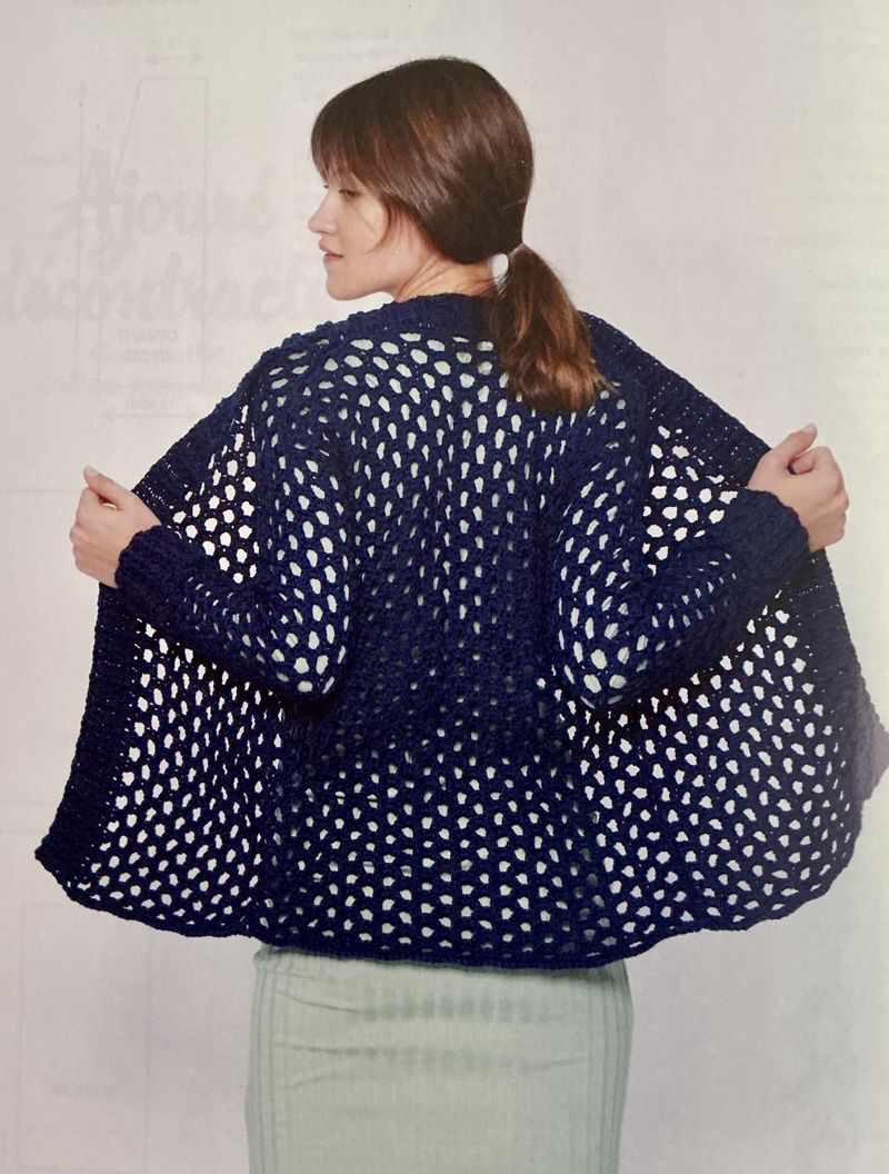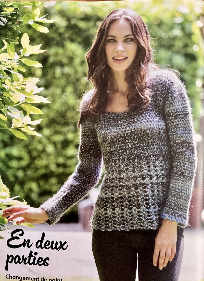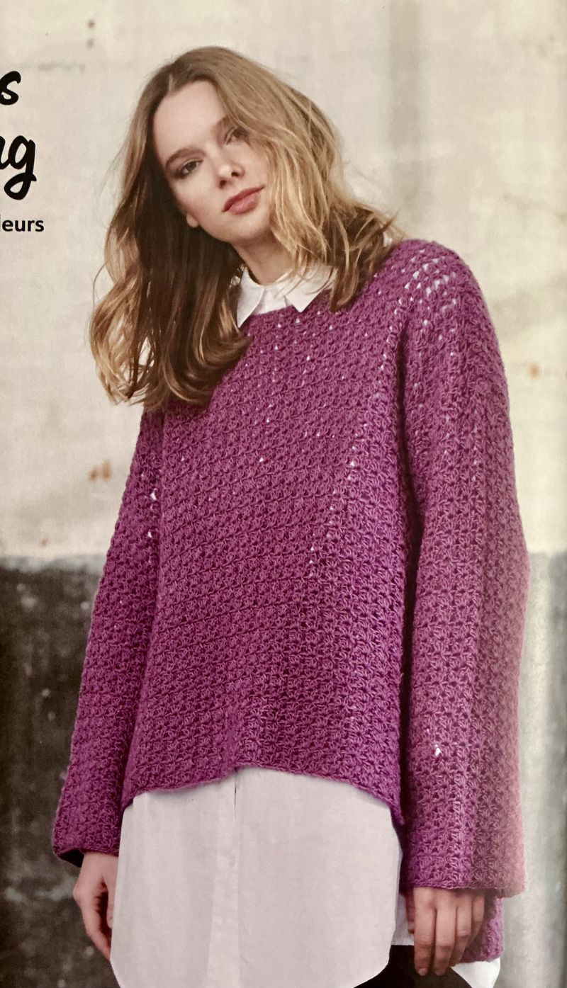 J’adore réellement ce pull ajouré. Sur le moment, je me suis demandé s’il se crochetait en diagonale, mais non. Une succession de brides et de mailles en l’air décalées à chaque rang, simple et efficace. En plus pas besoin d’être en permanence sur le diagrame.