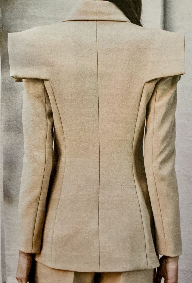 Ici ce n’est pas un coup de cœur à proprement parler, j’aime lorsque les créatrices font preuve d’audace avec des détails originaux. Ici, nous sommes servis dans deux versions presque similaires. J’ai nommé les épaules surdimensionnées. Alors autant pour le blazer, c’est harmonieux, mais pour la robe, c’est un grand non en ce qui me concerne.
