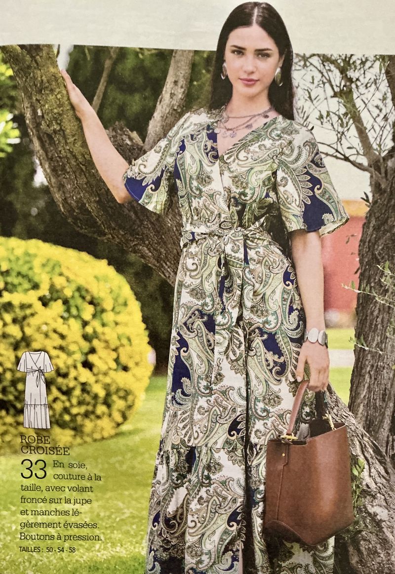 J’adore les robes, et j’aime beaucoup les manches papillons. Comme pour cette robe croisée avec encolure en V sur un cache-cœur. Elle est longue avec un large volant dans le bas.