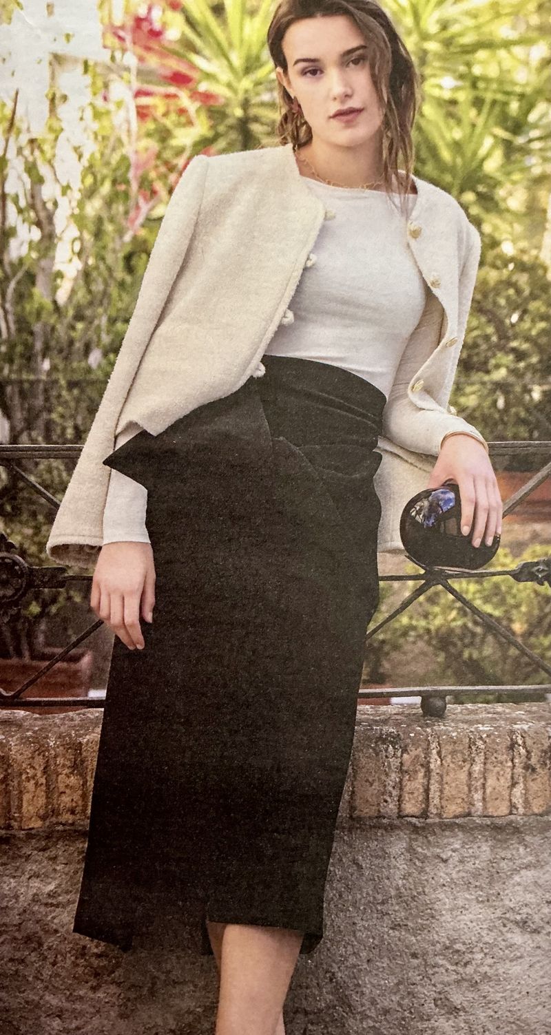 Ici, j’aime beaucoup cette jupe crayon, qui est sublimée par un nœud sur le devant. Elle est estampillée couture facile. J’ignore si cela convient lorsque l’on a du ventre.