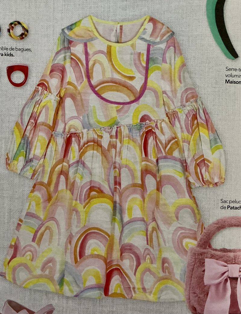 Quand j’ai vu cette robe pour enfant, je me suis dit, mais non ! Ce n’est pas possible de présenter une robe aussi mal cousue. En effet, le volant de celle-ci est incliné comme on peut le voir sur la photo et le dessin. Et le plastron n’est pas symétrique lui non plus. C’est un modèle Stella MCartney…. C’est original non ?
