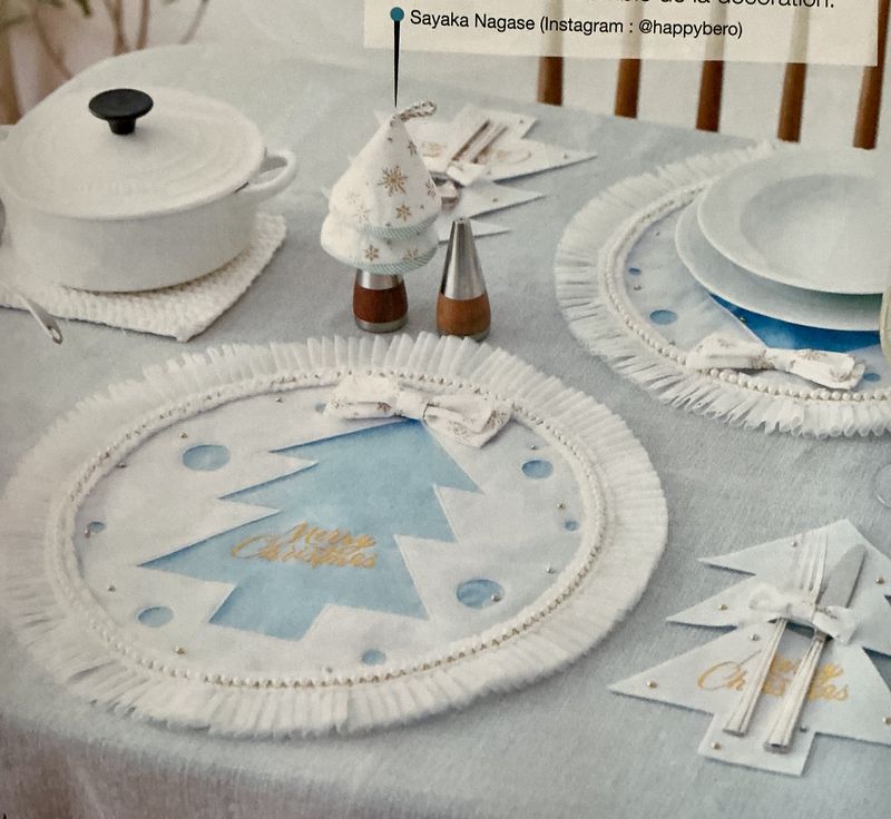 J’aime beaucoup l’idée de la déco de table. Le sapin découpé dans un cercle de simili, et ensuite ce sapin est transformé en range couvert. En plus nous sommes sur des tons bleus peu courant pour les fêtes.