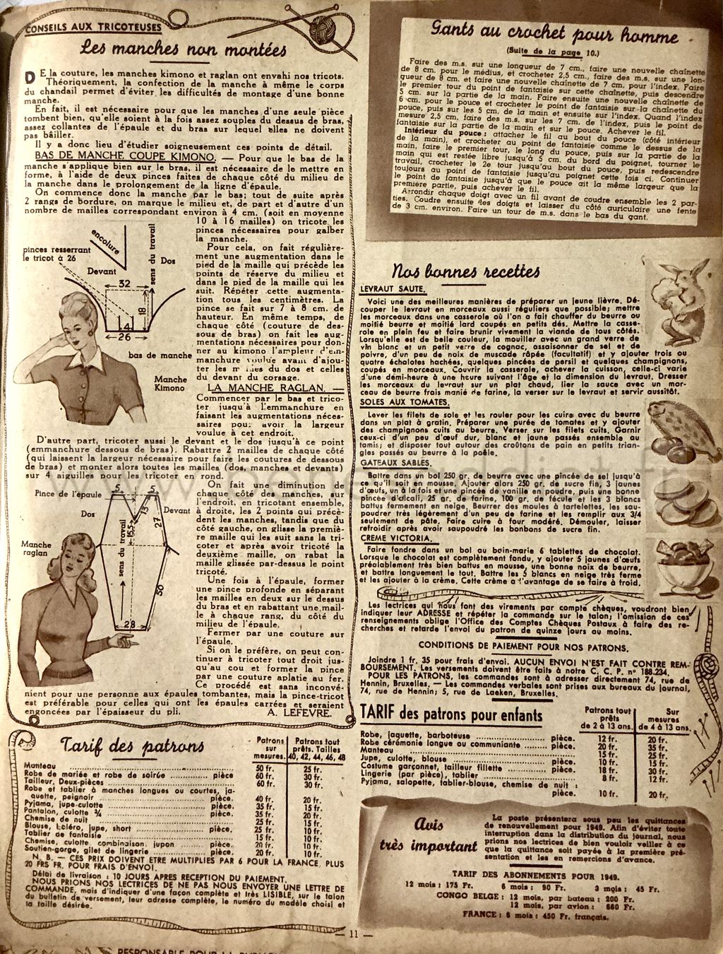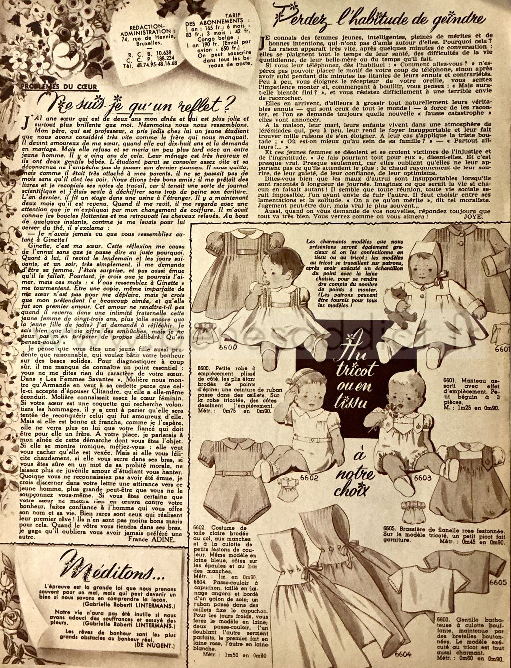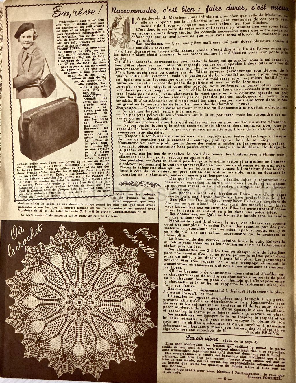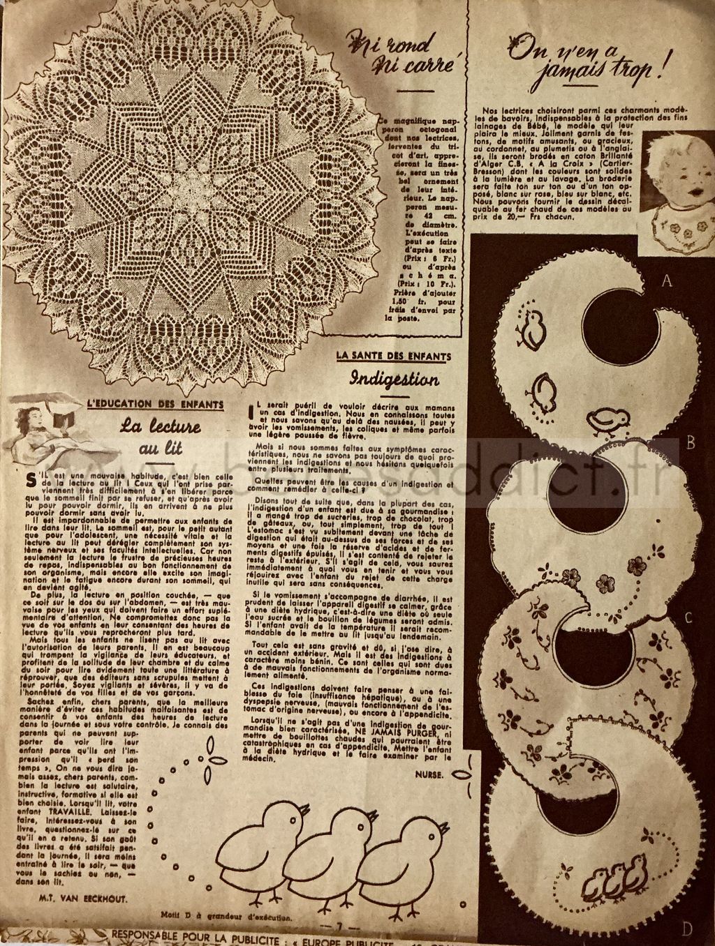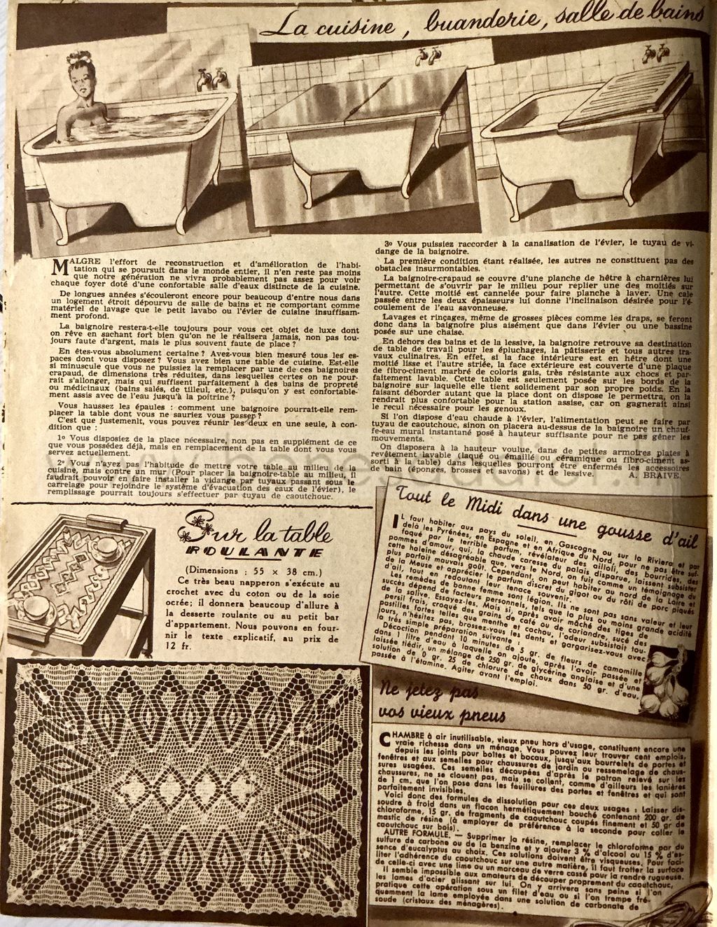 Ces pages jaunies que je partage ici mentionnent une garde-robe dernier cri, des astuces salle de bains, mais aussi une chambre d’enfant cosy et même des napperons crochetés. Ce ne sont pas de simples images vintage. Elles capturent l’essence d’un quotidien avec lequel chaque femme transformait des chutes de tissu en jupes plissées ou en napperons impeccables, suivant les patrons découpables insérés dans le magazine. Pour nos aïeules, post-crise de 1930 et après-guerre, c’était la survie : ravauder chaussettes, recycler robes démodées, égayer la table roulante avec trois fois rien.