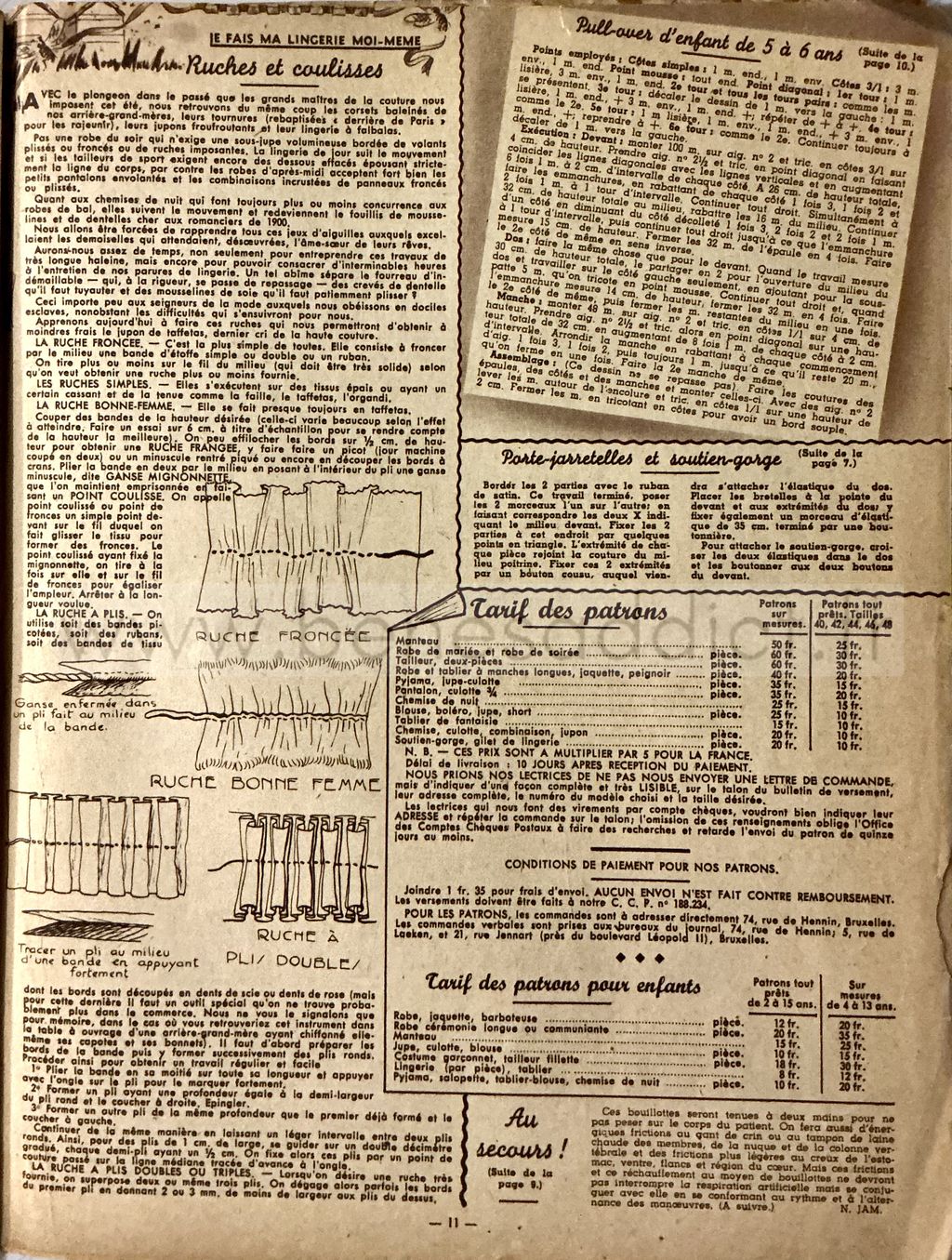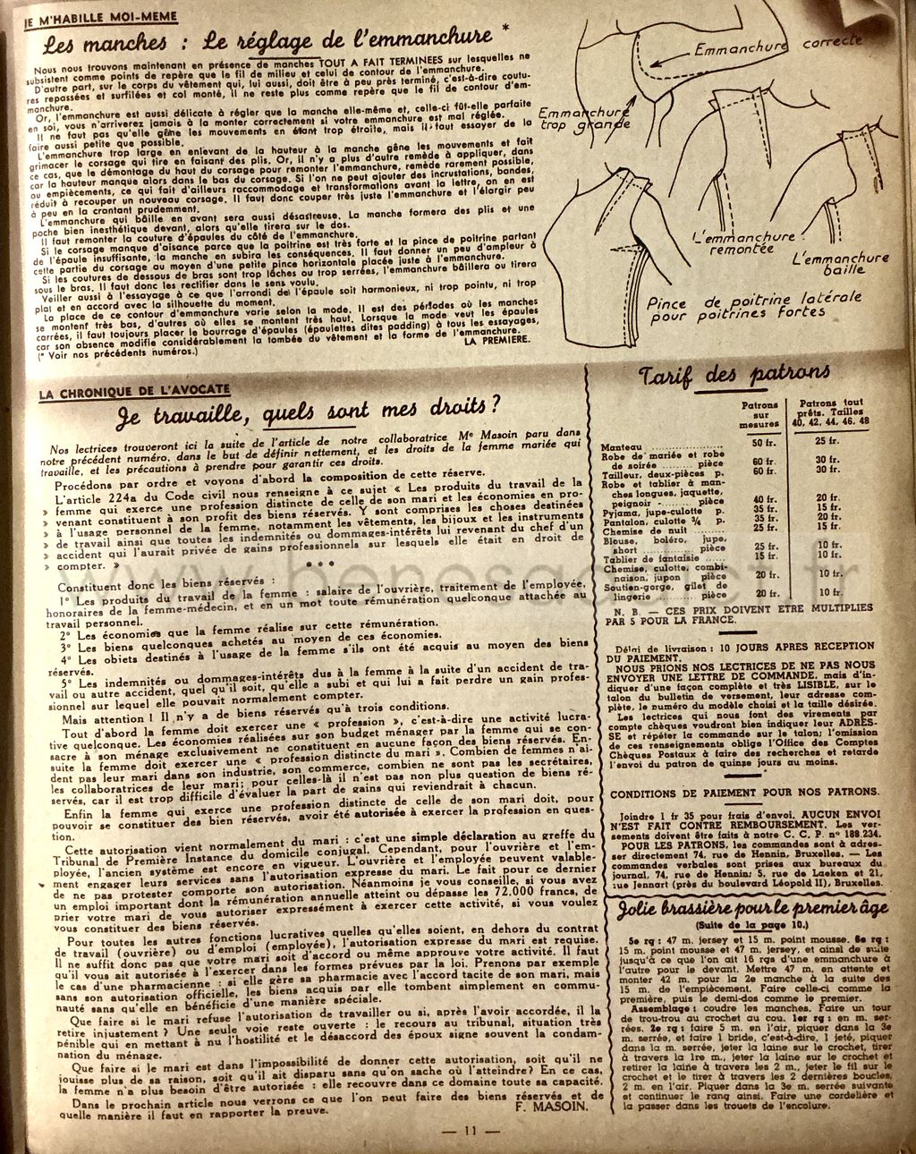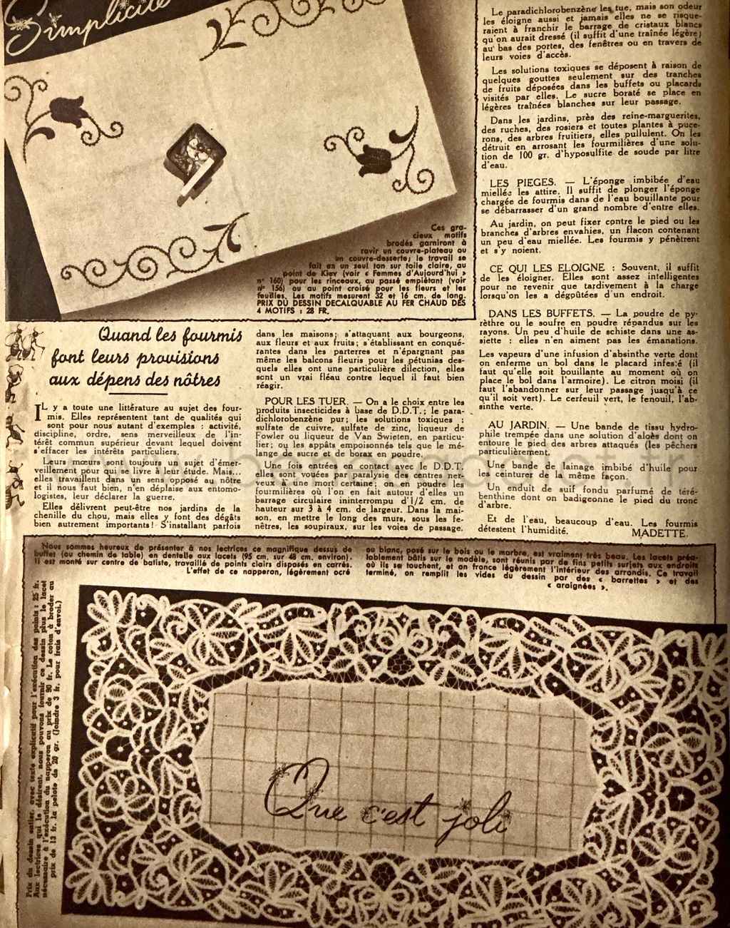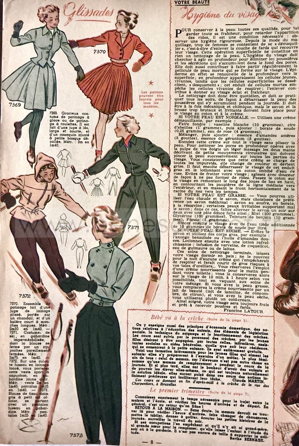 Ces pages jaunies que je partage ici mentionnent une garde-robe dernier cri, des astuces salle de bains, mais aussi une chambre d’enfant cosy et même des napperons crochetés. Ce ne sont pas de simples images vintage. Elles capturent l’essence d’un quotidien avec lequel chaque femme transformait des chutes de tissu en jupes plissées ou en napperons impeccables, suivant les patrons découpables insérés dans le magazine. Pour nos aïeules, post-crise de 1930 et après-guerre, c’était la survie : ravauder chaussettes, recycler robes démodées, égayer la table roulante avec trois fois rien.