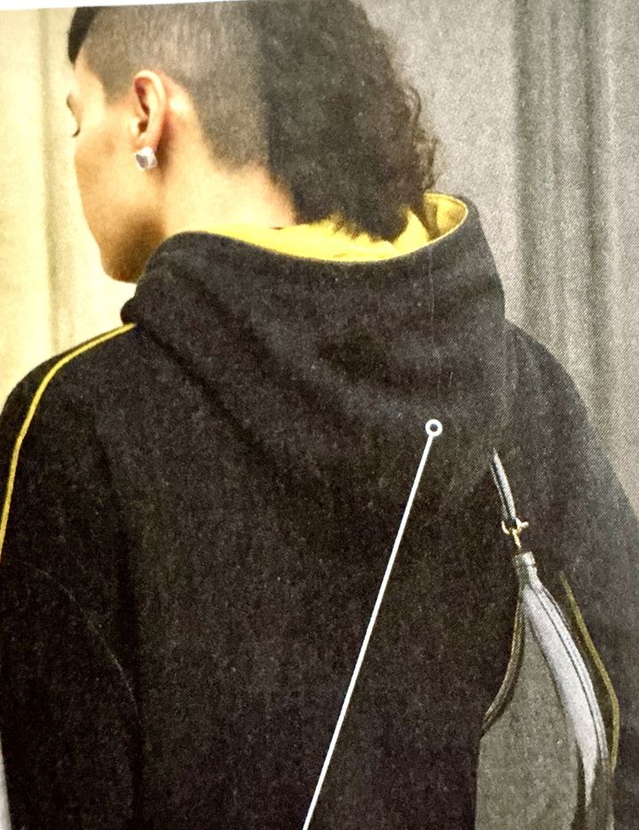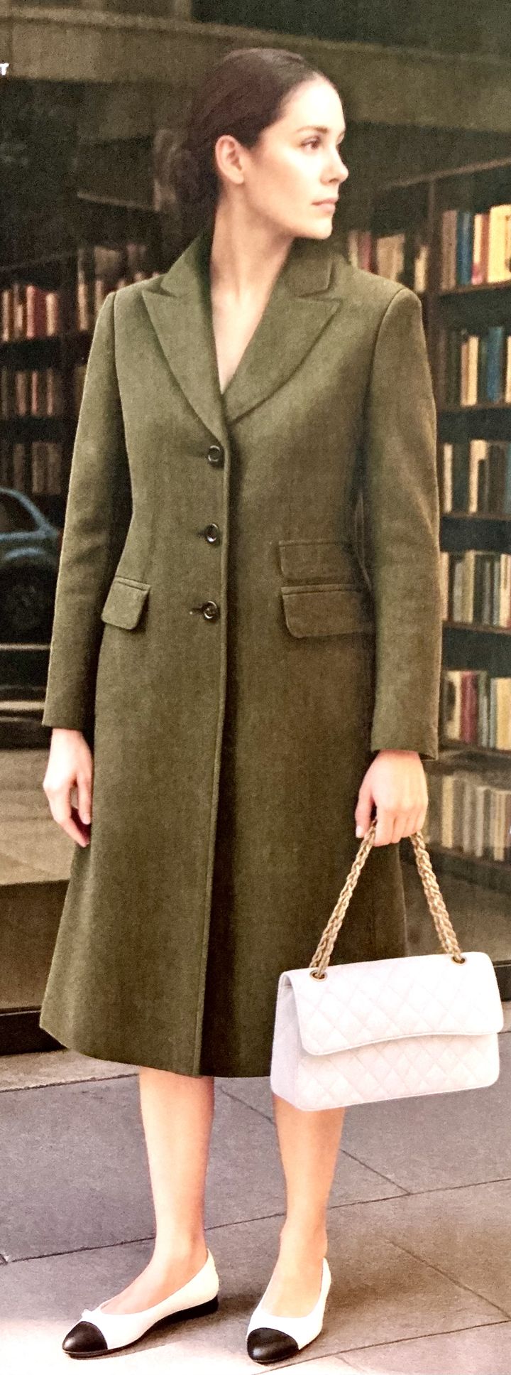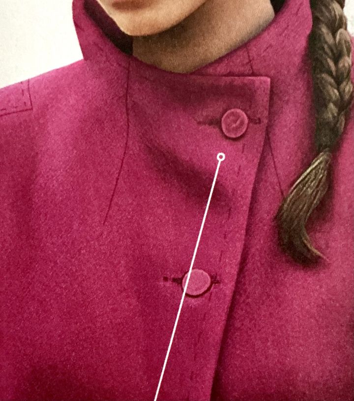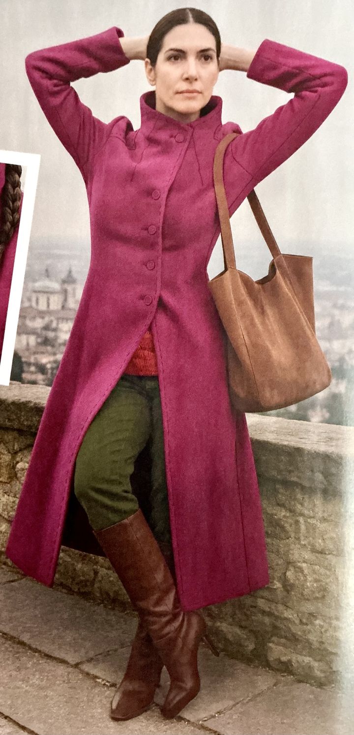 Voici un long manteau avec un double boutonnage asymétrique. Les devants se croisent sur le ventre et le haut du corps, c’est parfait pour combattre le froid. Le col se positionne différemment selon que le manteau est ouvert ou complètement fermé. Les manches et le dos sont garnies de découpes.