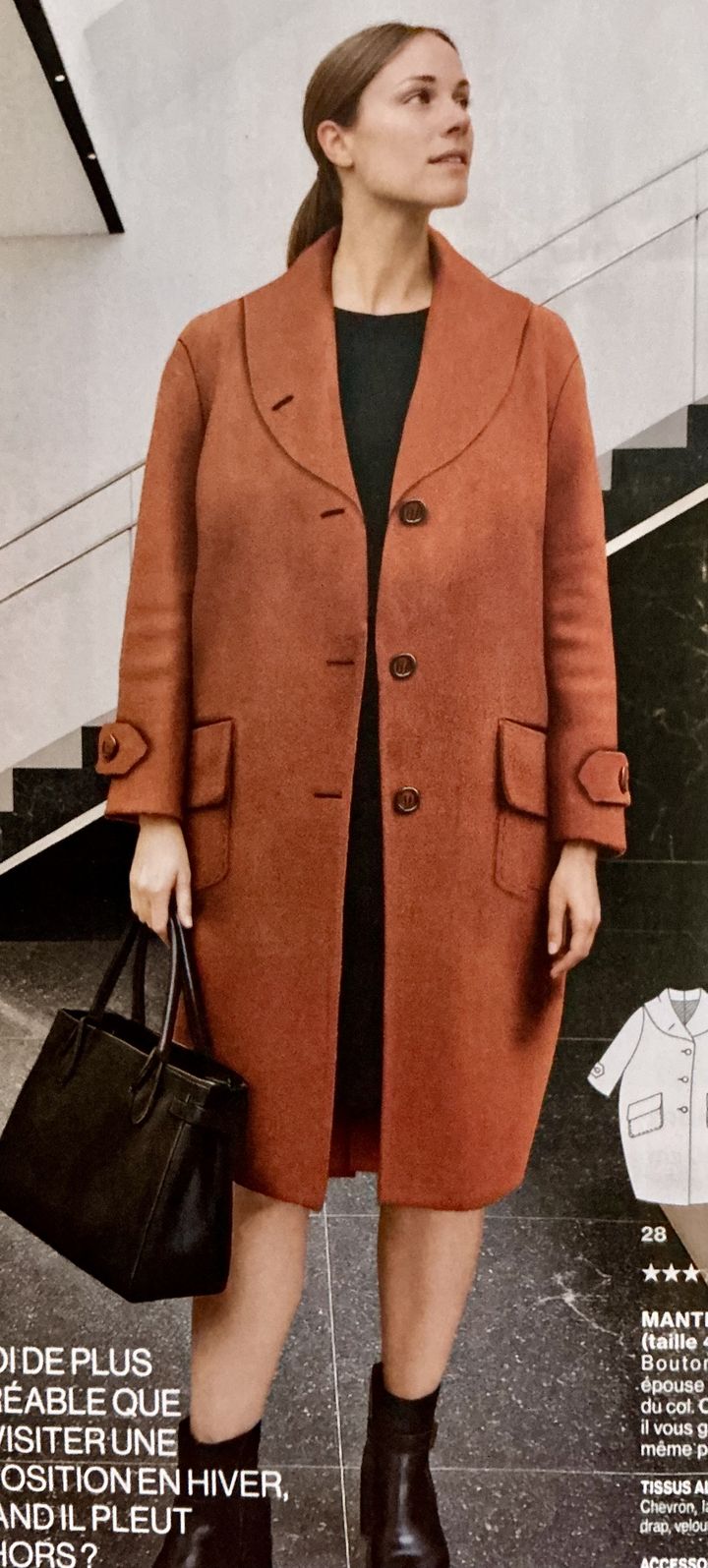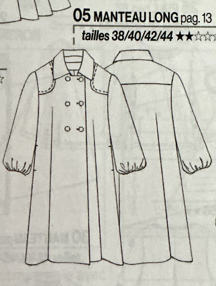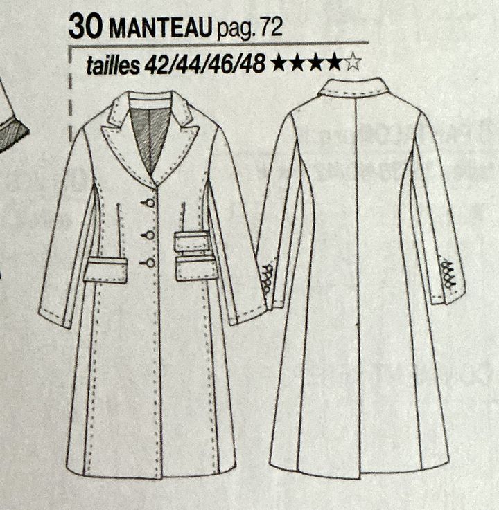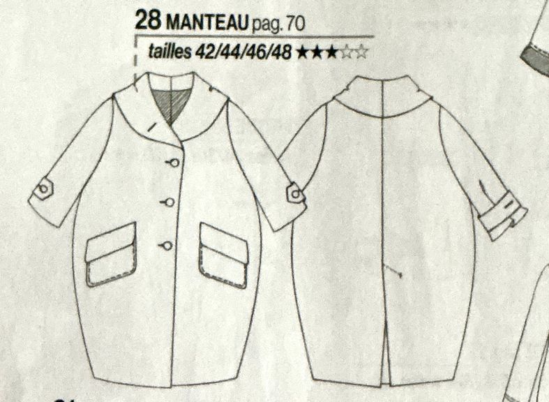 J’adore ce manteau, d’inspiration rétro, de forme boule, il comporte un large col châle. Il est simplement fermé à l’aide de boutons, et possède des poches plaquées à rabat. Les manches sont terminées par une patte à bouton permettant de cintrer plus ou moins les bas de manches.