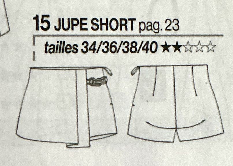 Voici une belle alternative à la minijupe. Il s’agit d’un short taille haute, avec un pan de jupe façon kilt sur le devant. Il se ferme à l’aide d’une fermeture à glissière cousue dans la couture de côté.