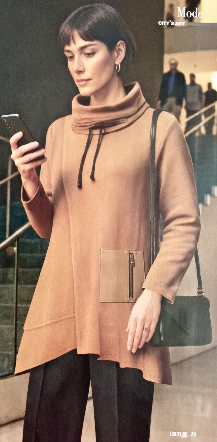 Voici un genre de robe tout confort. Le col roulé est ajusté à l’aide d’un cordon. Le dos et le devant forment deux pans croisés.