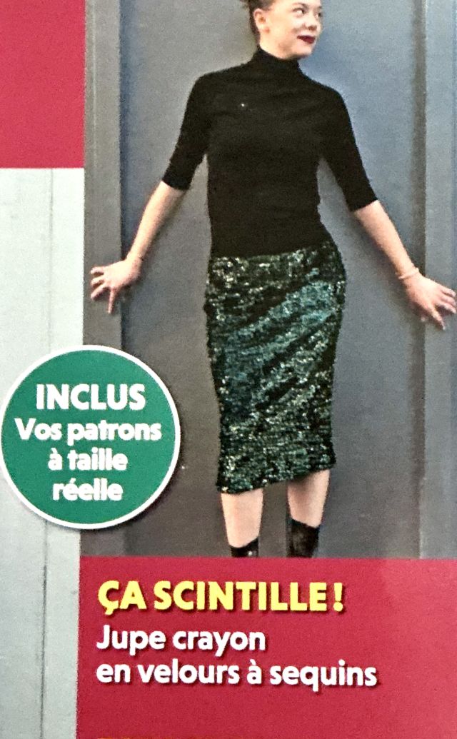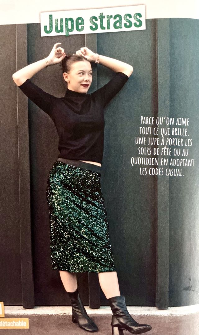 Les paillettes, c’est la fête ! Il n’y a pas de saison pour en porter. Pourquoi pas une jupe crayon, ici en version jupe à sequins. J’ai failli y laisser ma machine à coudre la seule fois que j’ai touché ce genre de tissus. Donc très peu pour moi, même si j’adore les paillettes.
