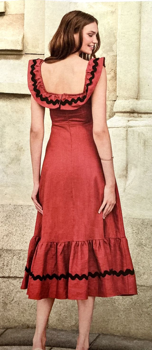 La subtilité, c’est ce qui manque au modèle précédent. C’est ce que l’on retrouve dans cette robe de printemps. En effet, elle laisse apparaitre la peau. Le haut du devant et sa jupe comportent une ouverture. Le buste se noue pour fermer la robe. Il est bordé d’un parement dos et devant. La jupe est à panneaux.