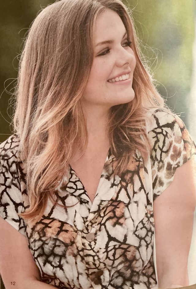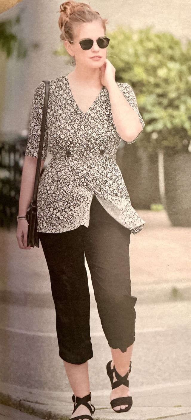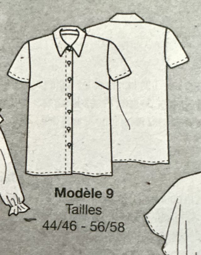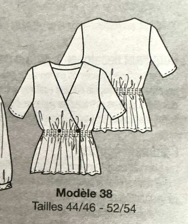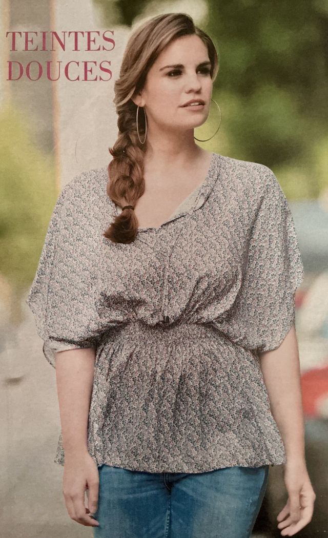 J’ai dans mon dressing une blouse croisée comme celle-ci. Son ampleur est canalisée à la taille à l’aide d’élastique à smocks. Elle est garnie de deux boutons sur une encolure en V. Les manches sont courtes. Je trouve que ça allonge la silhouette.