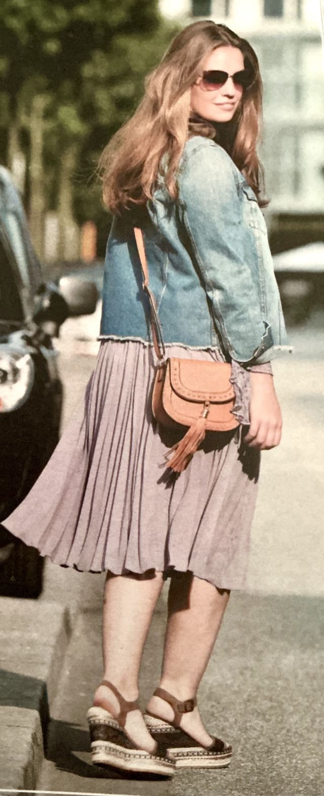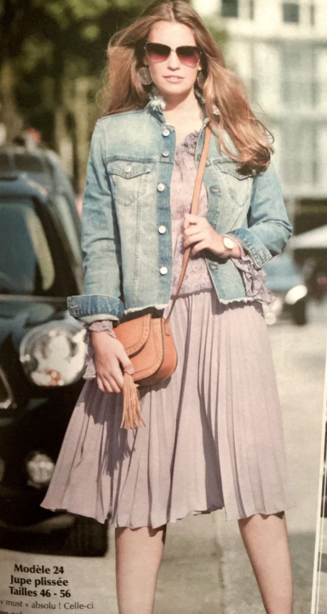 Voici un modèle de jupe que j’adore maintenant, mais le tissu plissé coute si cher ! Si vous avez des bons plans, je prends. J’aime surtout en version très longue et avec un élastique à la taille. Ici la version s’arrête aux genoux et possède une ceinture ajustée et une fermeture à glissière dans le dos.