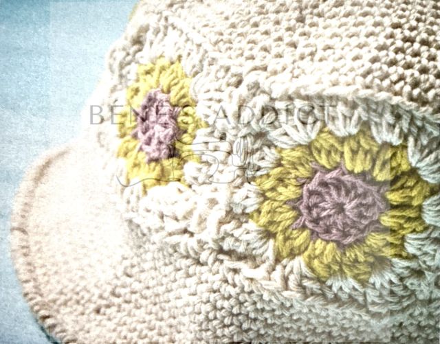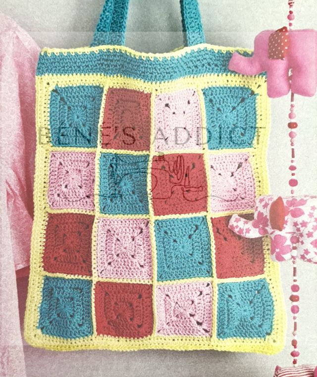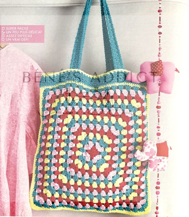Ici aussi, j’aime beaucoup le choix des différents coloris. Toujours le même granny, mais la disposition des teintes n’est jamais pareil. Cela apporte du dynamisme. J’aime beaucoup le résultat de ce sac cabas.